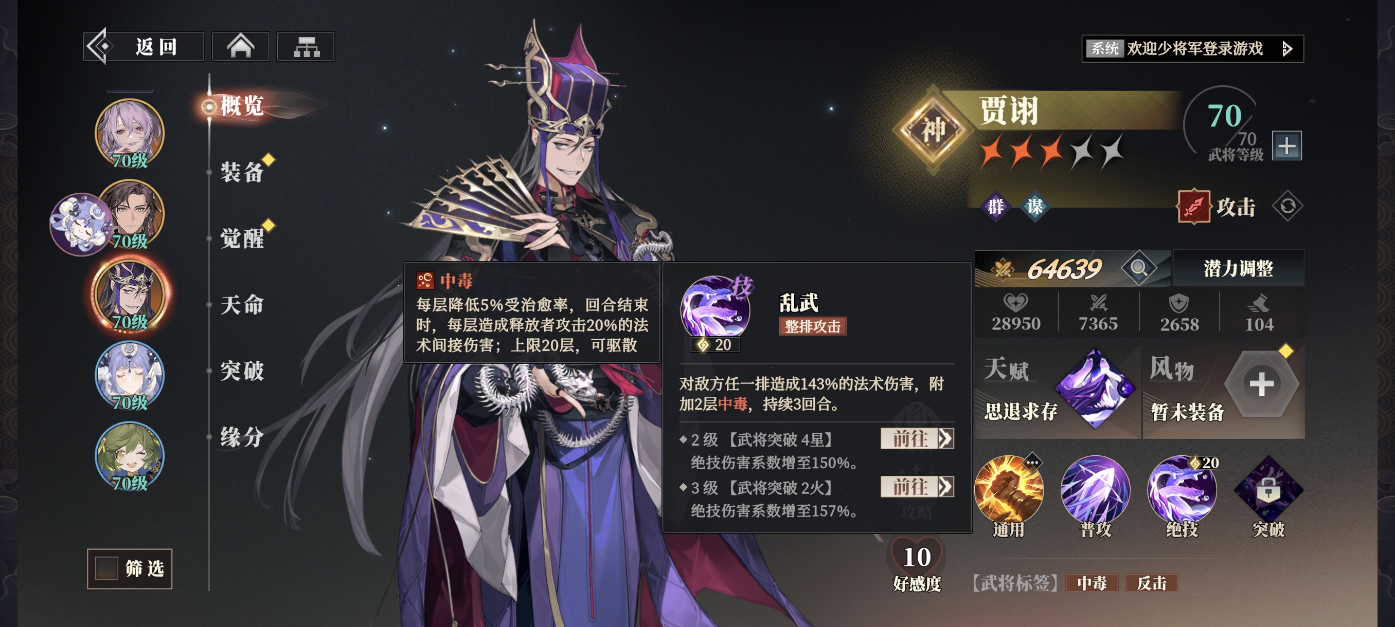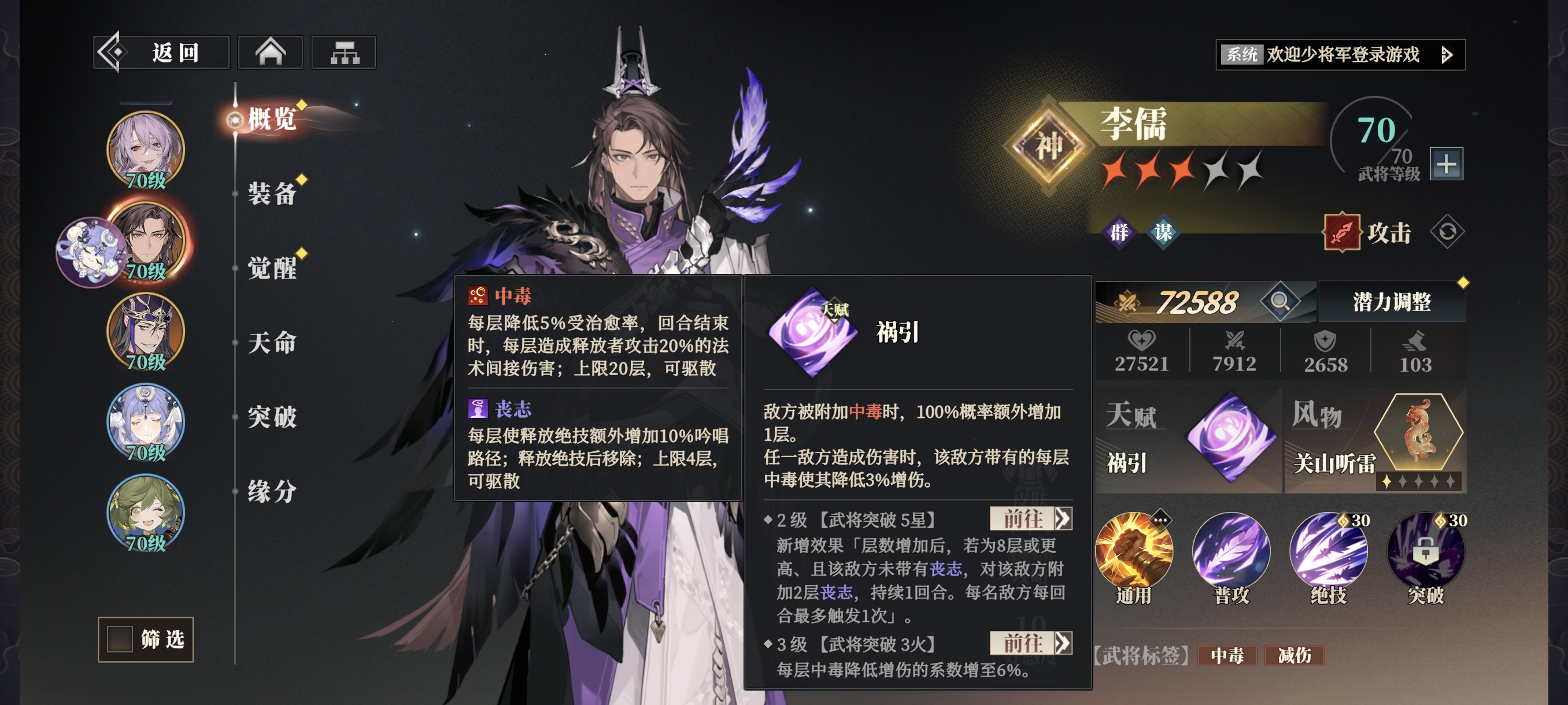 当【中毒】叠加到8层以上时,李儒都会通过天赋对其附加2层【丧志】,再加上朱然天赋的周围友军攻击附加【丧志】,很容易对大部分敌方都挂上【丧志】,从而增加打断触发的频率,甚至使甘宁触发连续打断。