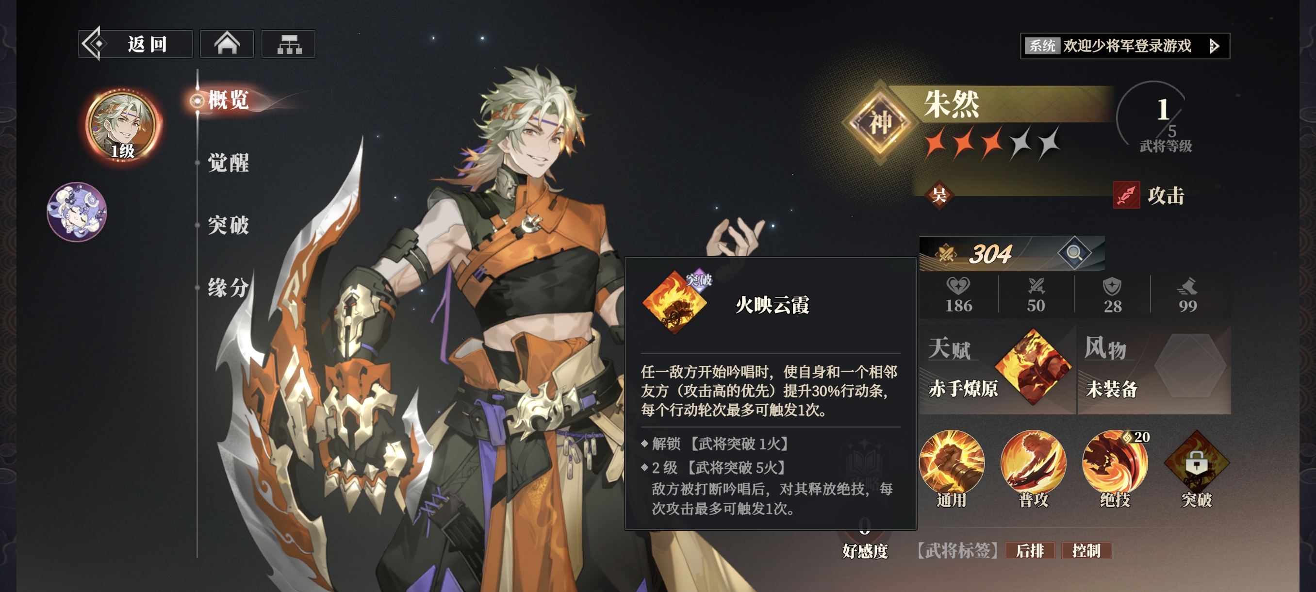 突破天赋是朱然的核心机制之一,他的初始速度为99,接近最低档,但是凭借突破天赋的自拉条却能经常在时序上实现反超,在敌方吟唱时进行打断。