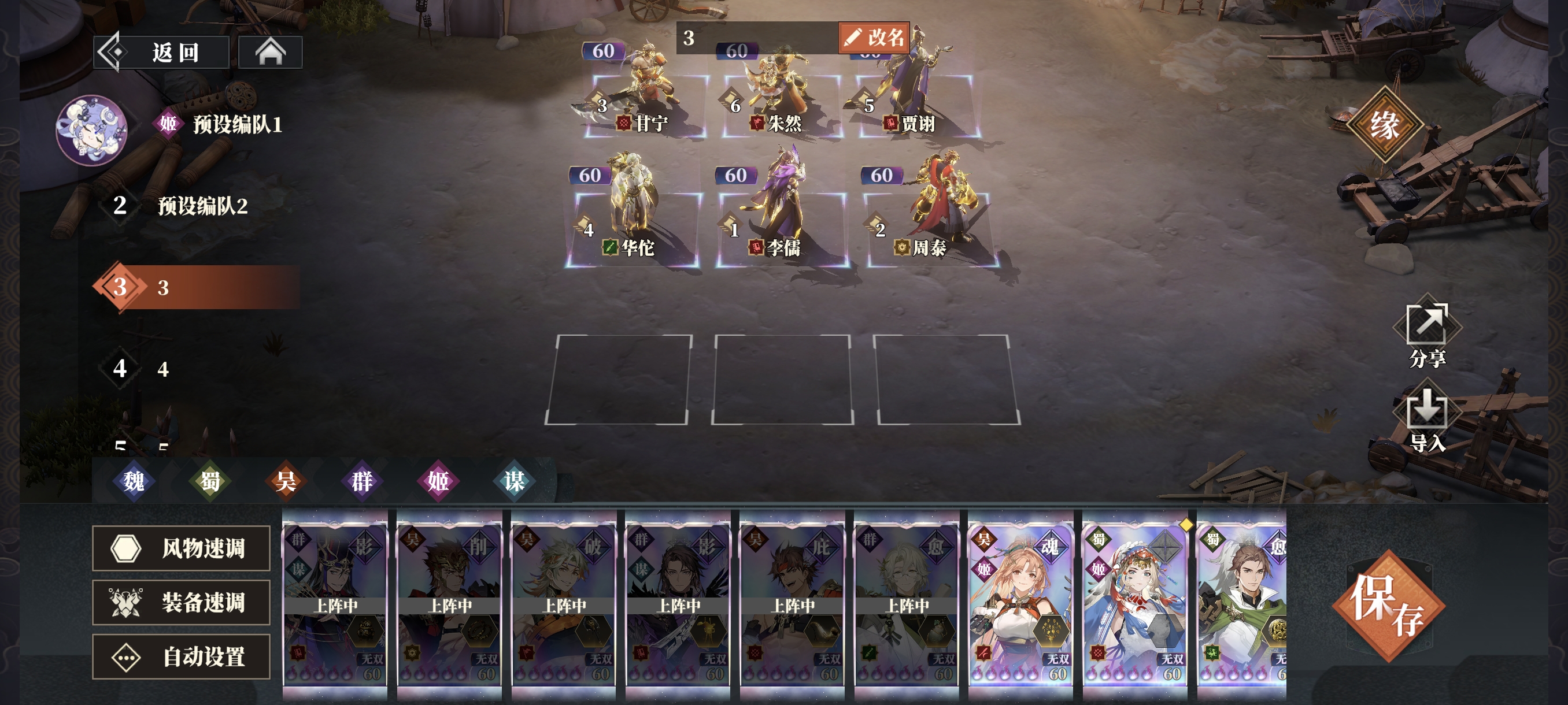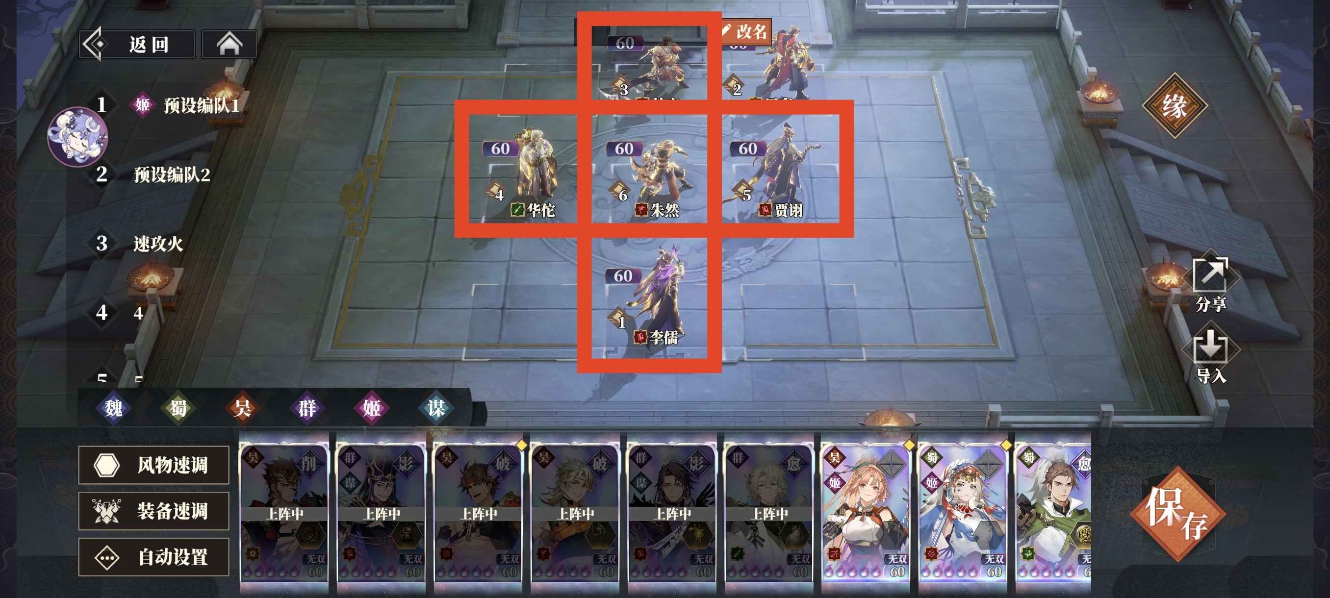 四、阵容推荐1、朱然+周泰+甘宁+华佗+贾诩+李儒