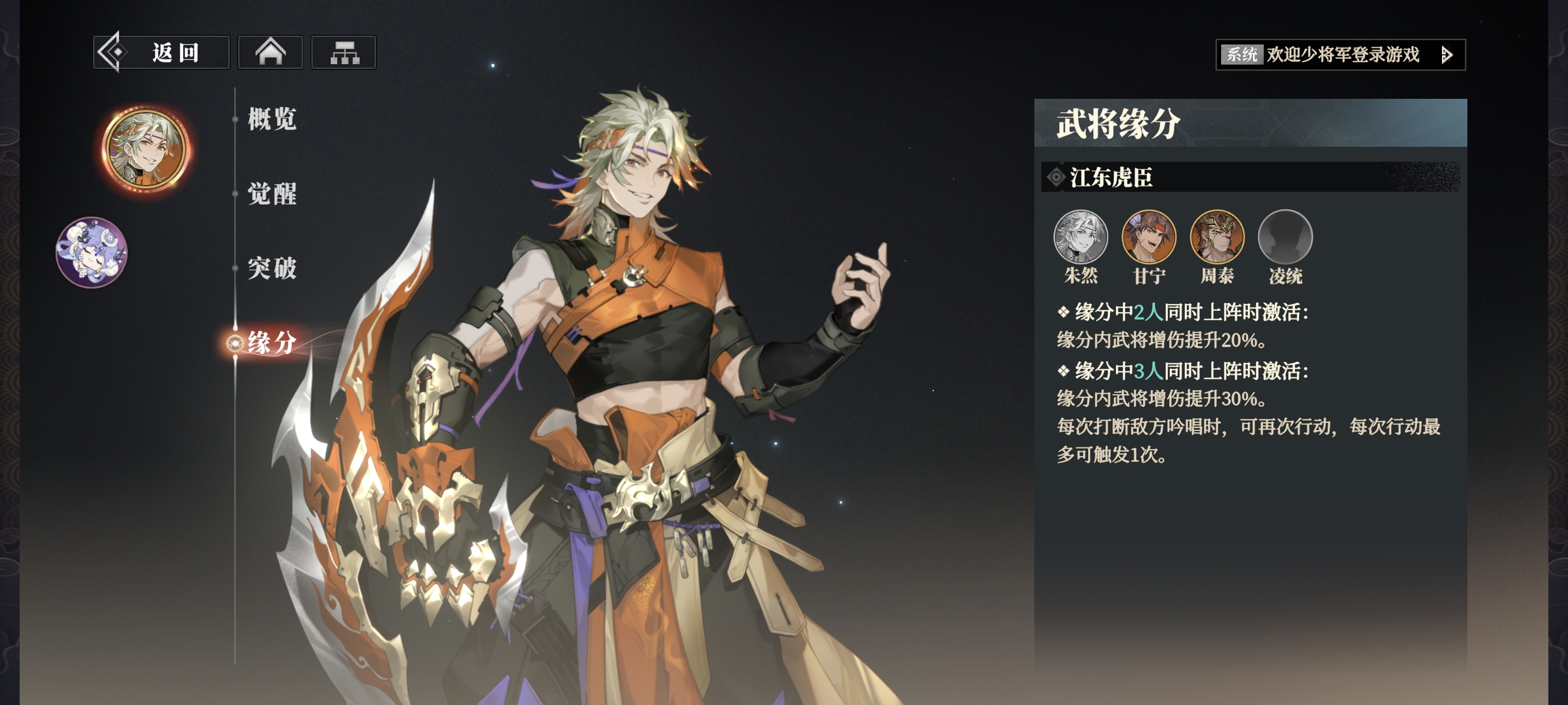 二、缘分分析朱然的缘分【江东虎臣】是一个全新机制的特殊缘分,在打断敌方吟唱时,可使缘分内武将再次行动。(每回合限1次)