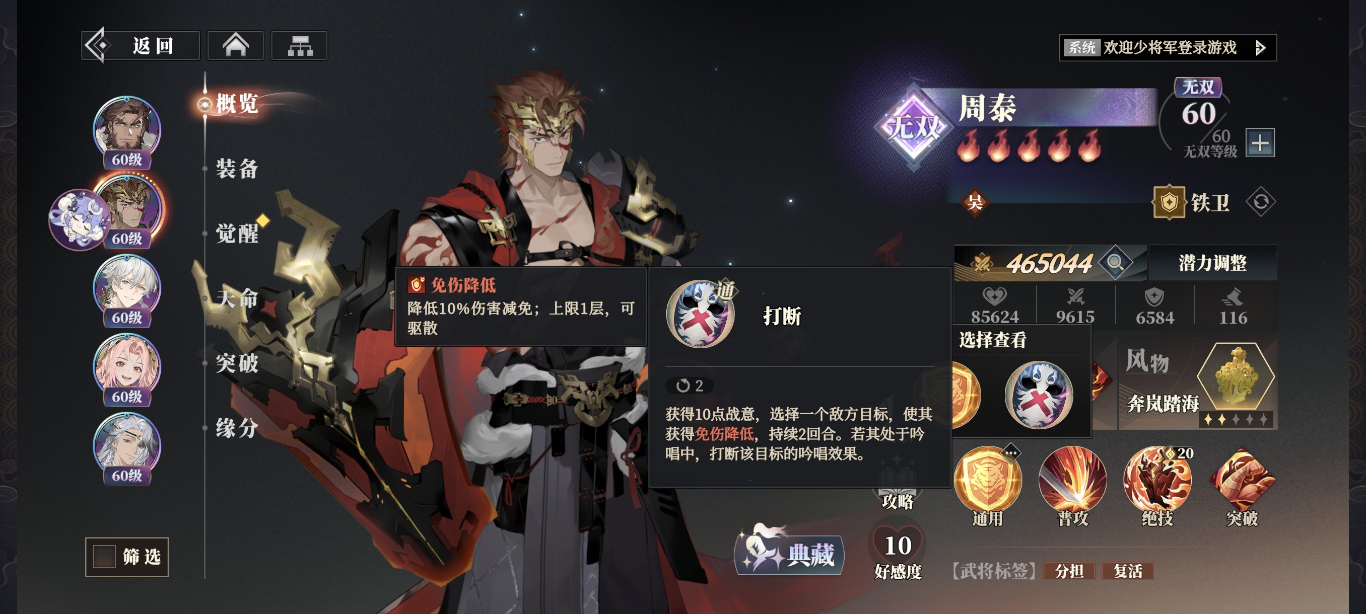 5火时突破天赋还能让他在敌方被打断后立即对目标施放1次绝技(只对自身有效),实战中基本能保持每回合2次以上的绝技频率,为敌方附加大量减益和控制。