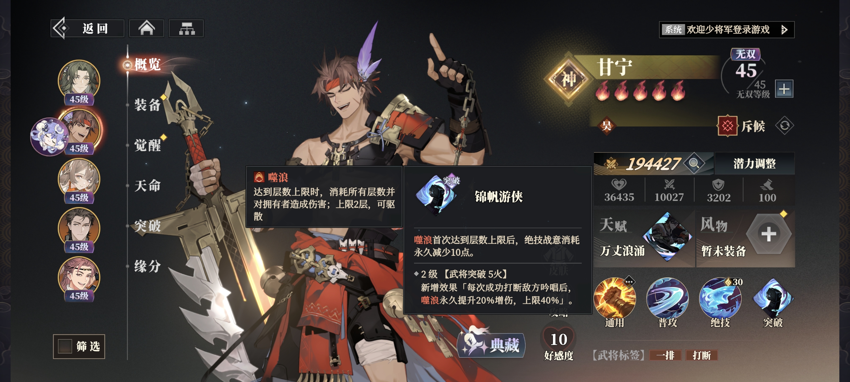 甘宁打断时,还可以提升【噬浪】的增伤,触发连续打断时,有极高的爆发能力。