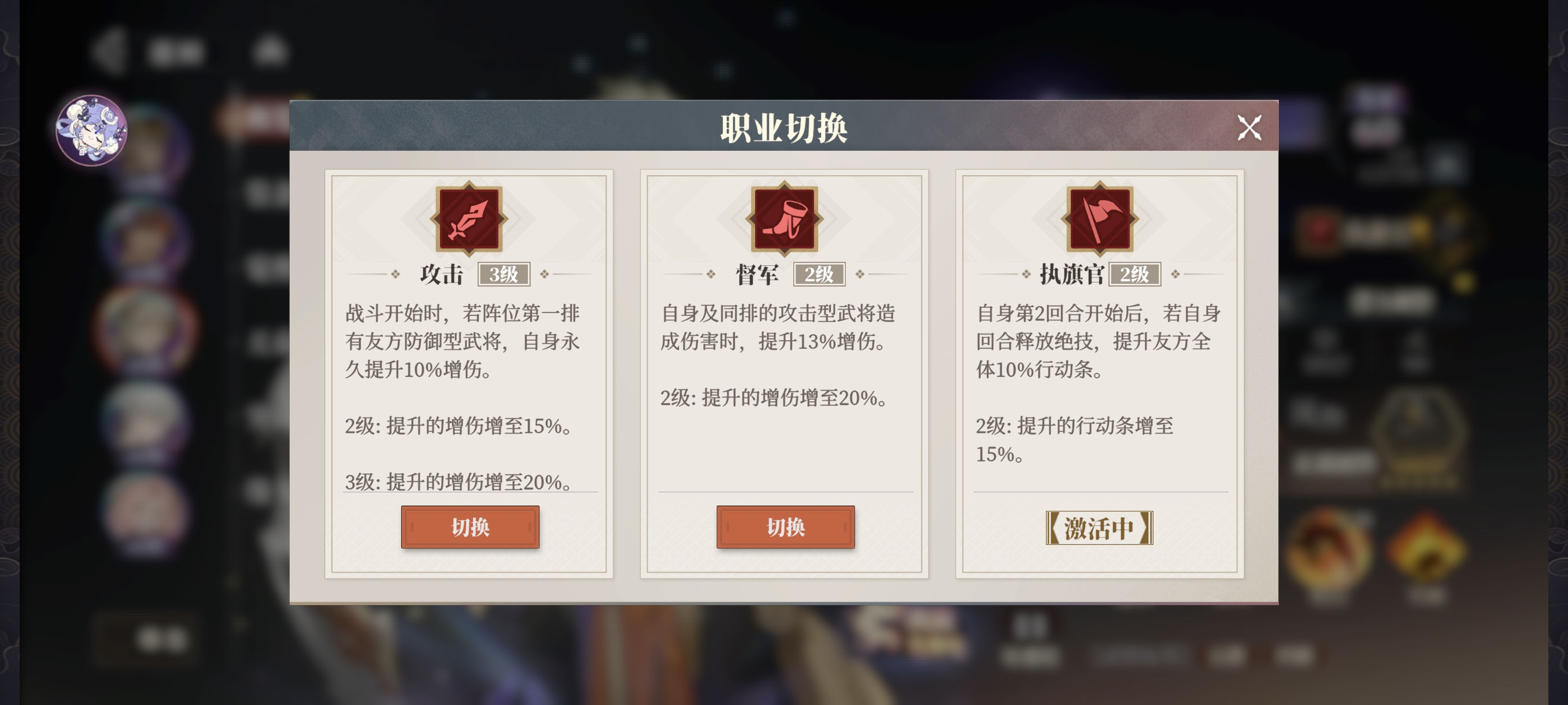 朱然的职业推荐选择【执旗官】,目前所有的执旗官职业武将绝技均为30战意消耗,而朱然是唯一一名20战意消耗的执旗官,大幅提高了长线战斗中执旗官触发全体拉条的性价比。