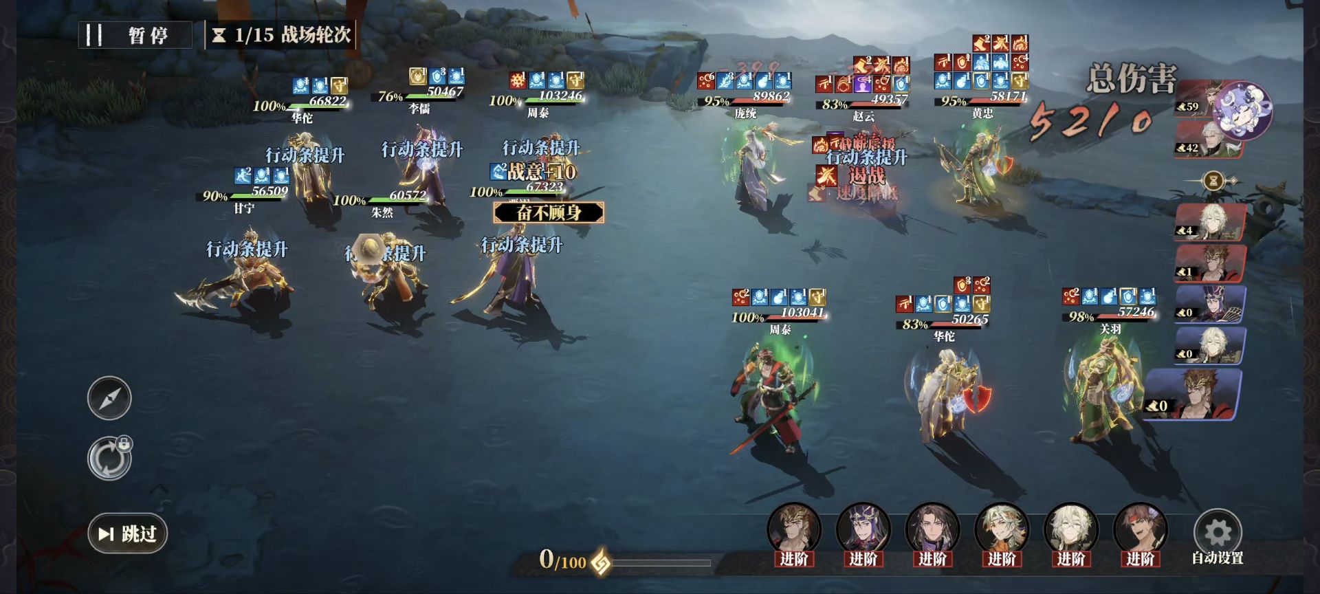 并且朱然因为其缘分再动的特殊性,如果第一回合触发了打断再动,连续施放2次绝技,就能在第1回合(自身第2回合)触发全体拉条效果,启动速度比其他【执旗官】更快。
