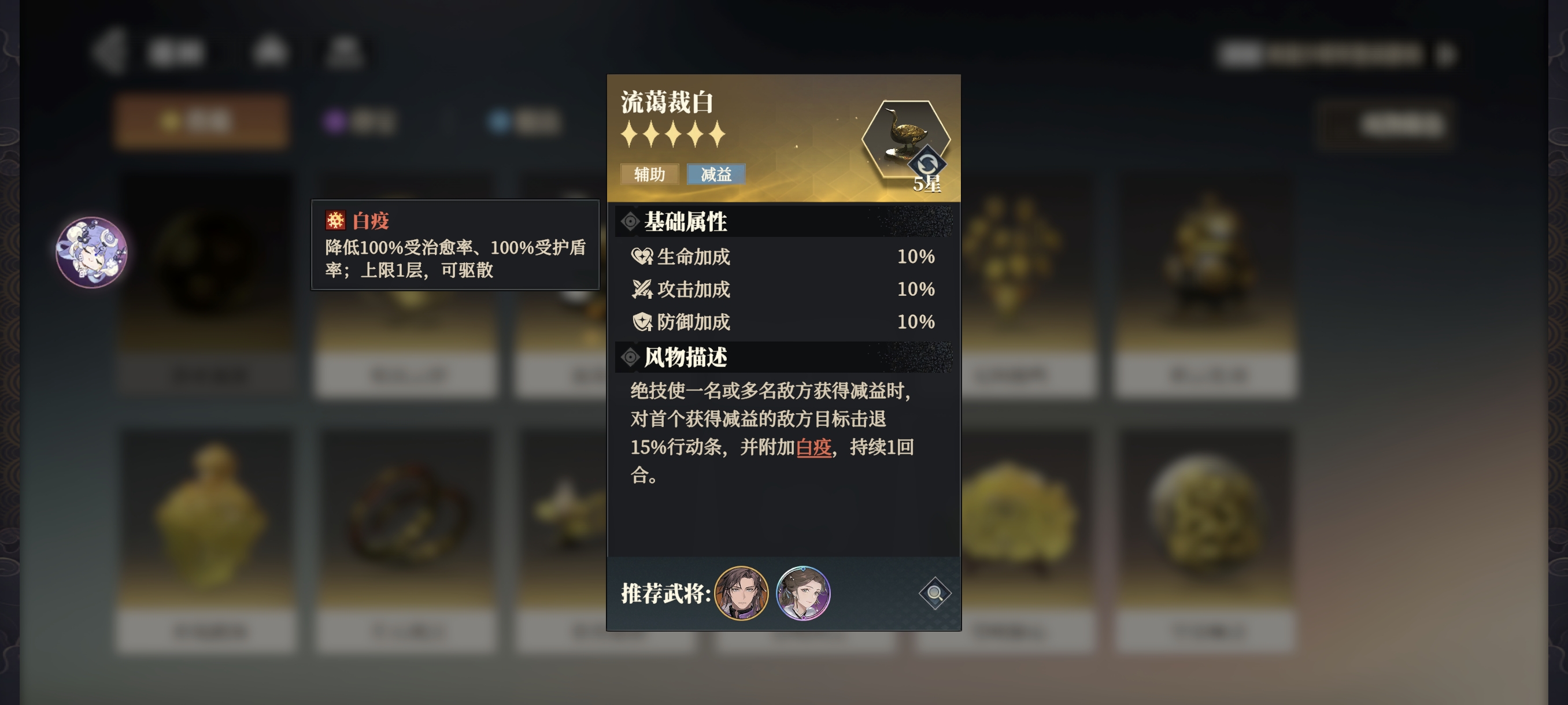 流蔼裁白能在绝技附加减益时,额外推条15%并附加【白疫】,朱然的绝技本身能附加【截断后援】,符合该风物的使用条件。