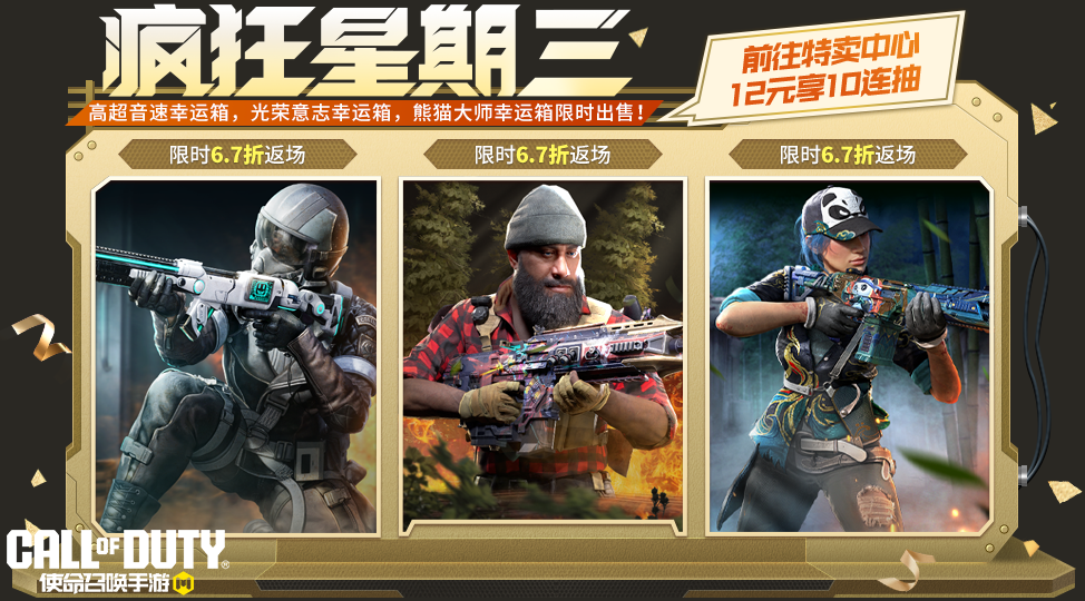 疯狂星期三活动期间,战士们将享受6.7折的超值福利优惠。本次返场的三个宝箱各拥有一次特惠十连抽体验,战士们前往“特卖中心”,花费12软妹币即可十连抽一次!