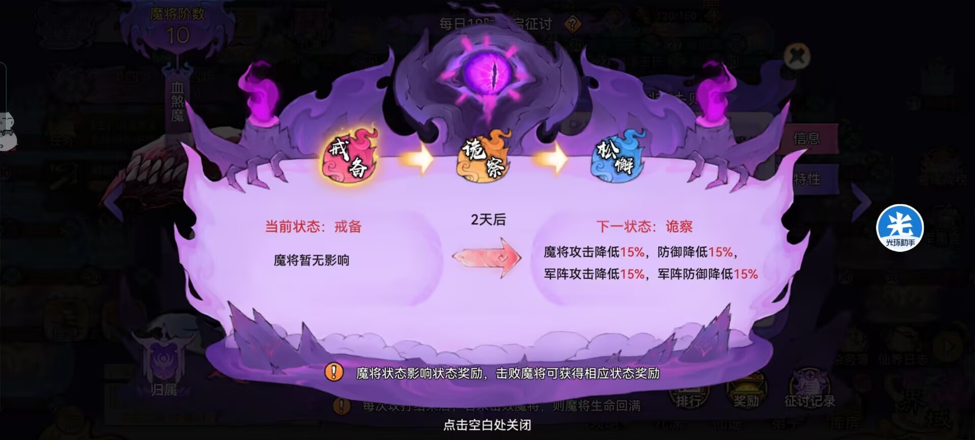每隔2天魔将都会削弱,分为:戒备、诡察、松懈。魔将状态越差,自然我们打的伤害的会更高。