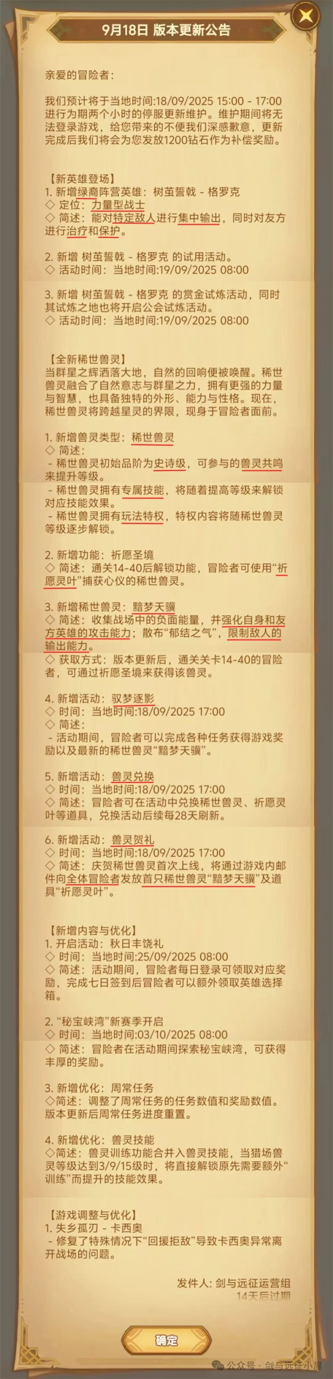 本次停服维护更新内容仅适用于《剑与远征》先锋服,版本实际更新内容请以正式服上线后为准。