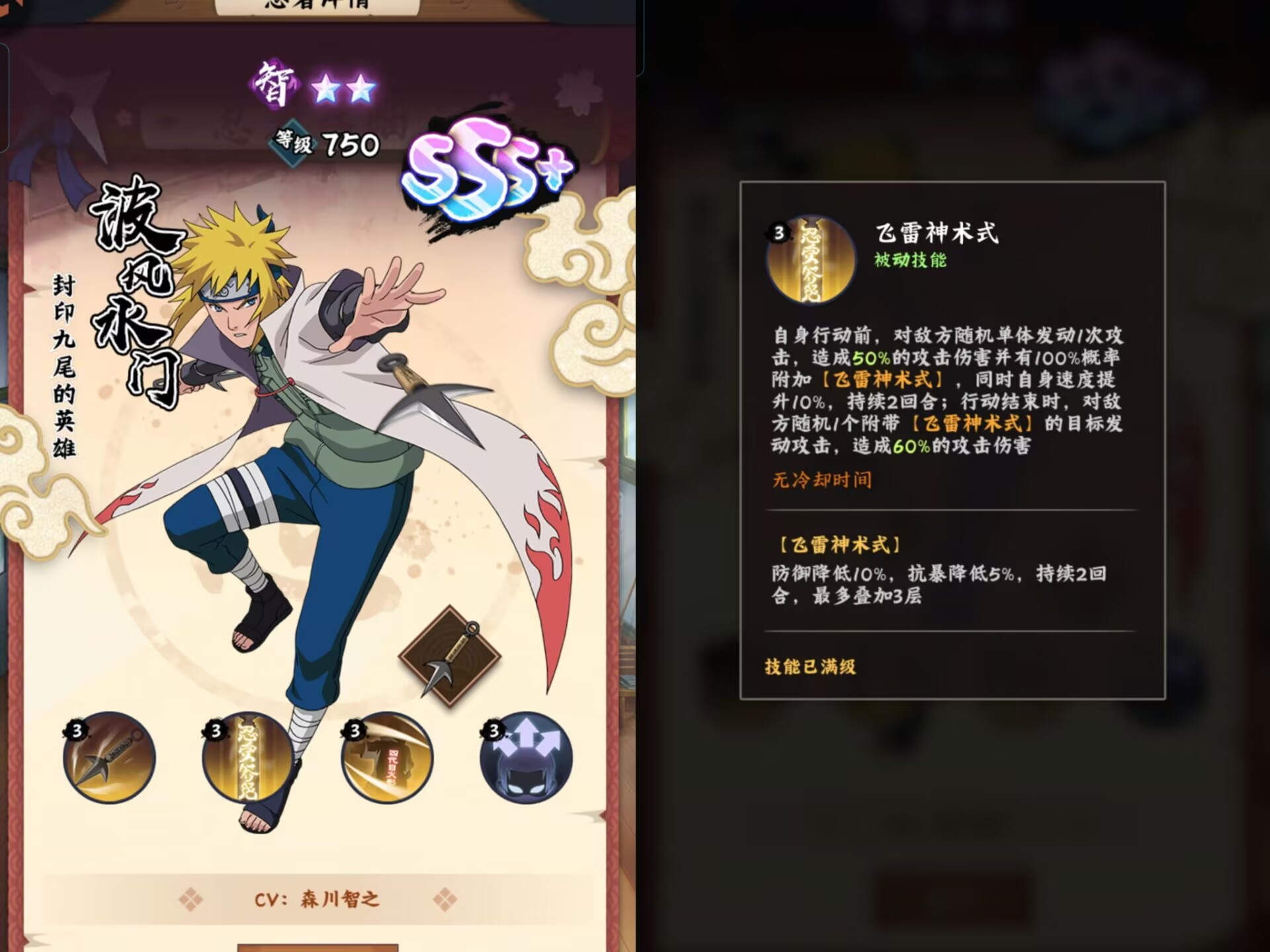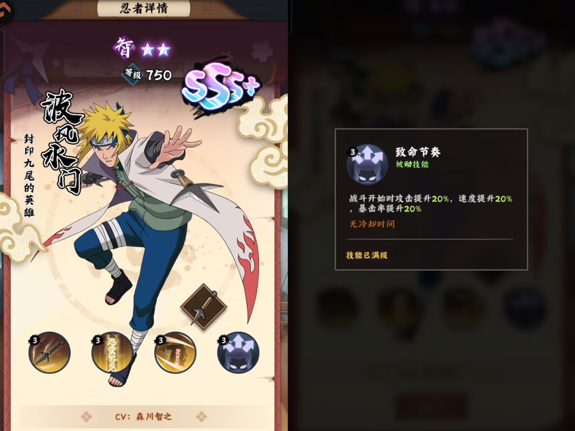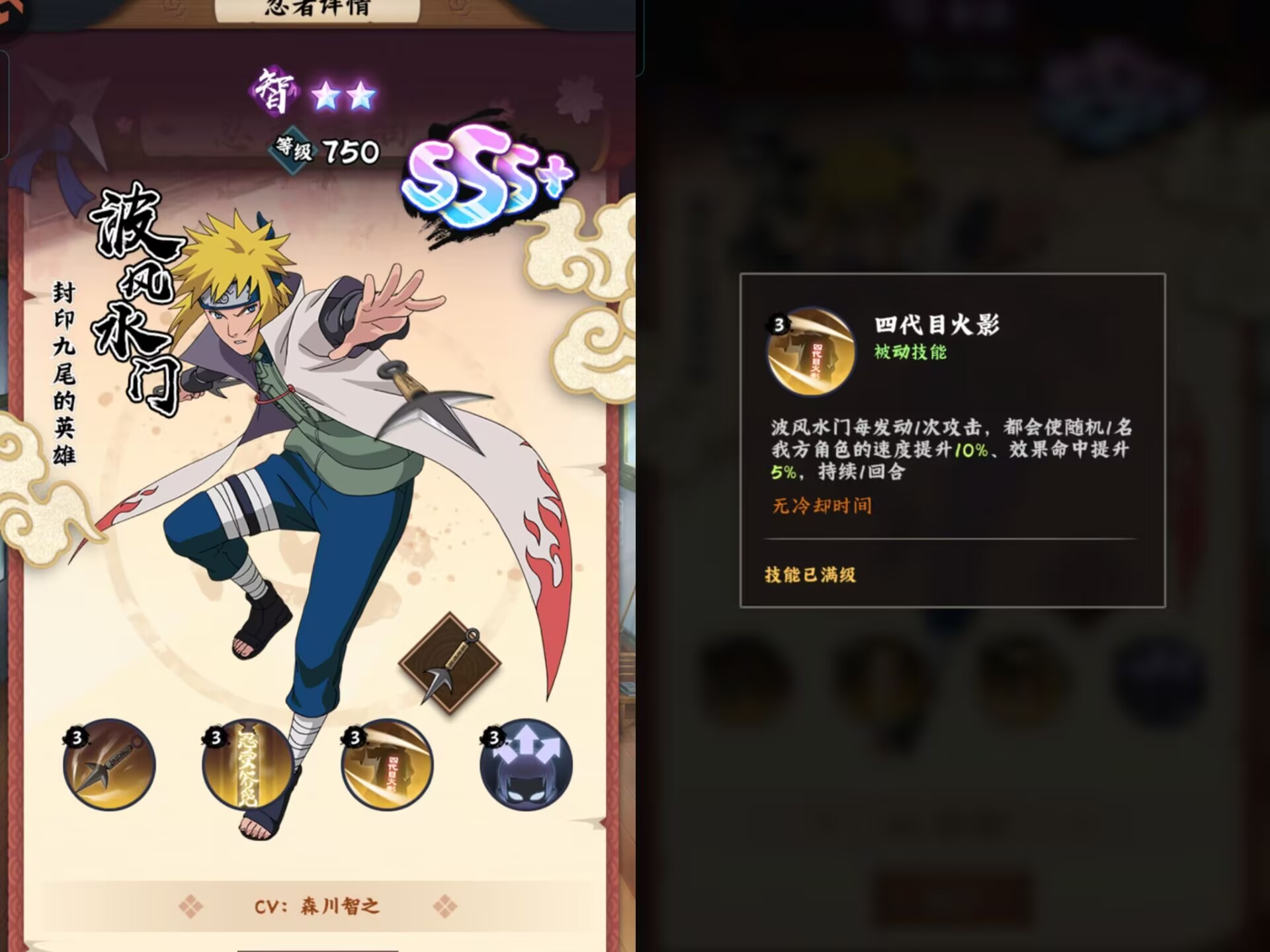 ②被动释放以后:提升自身10%速度(因此水门的战斗中速度都是>其他忍者的)