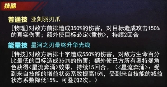 2. 能量技 (特技)对敌方后排十字造成550%伤害,并对生命最低目标额外造成350%伤害;使己方所有奥特曼获得〈星流奔涌〉效果15回合(可叠加2次)。〈星流奔涌〉: 提高自身来自技能的增益状态系数15%,降低来自技能的减益状态系数15%。