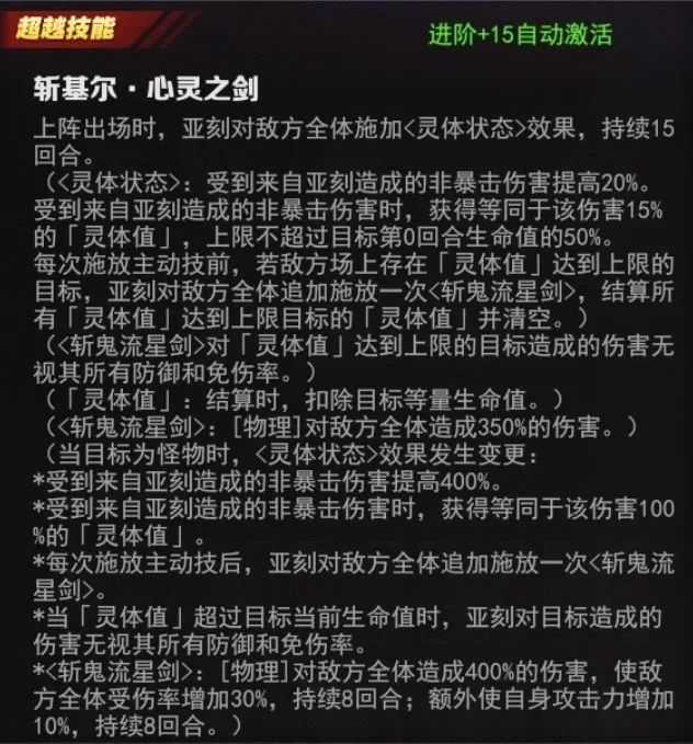 效果: 出场为敌方全体施加〈灵体状态〉。亚刻的攻击会积累目标的“灵体值”,当灵体值达到上限时,会触发“斩鬼流星剑”直接扣除敌人相应百分比的生命值(无视防御和免伤!)。