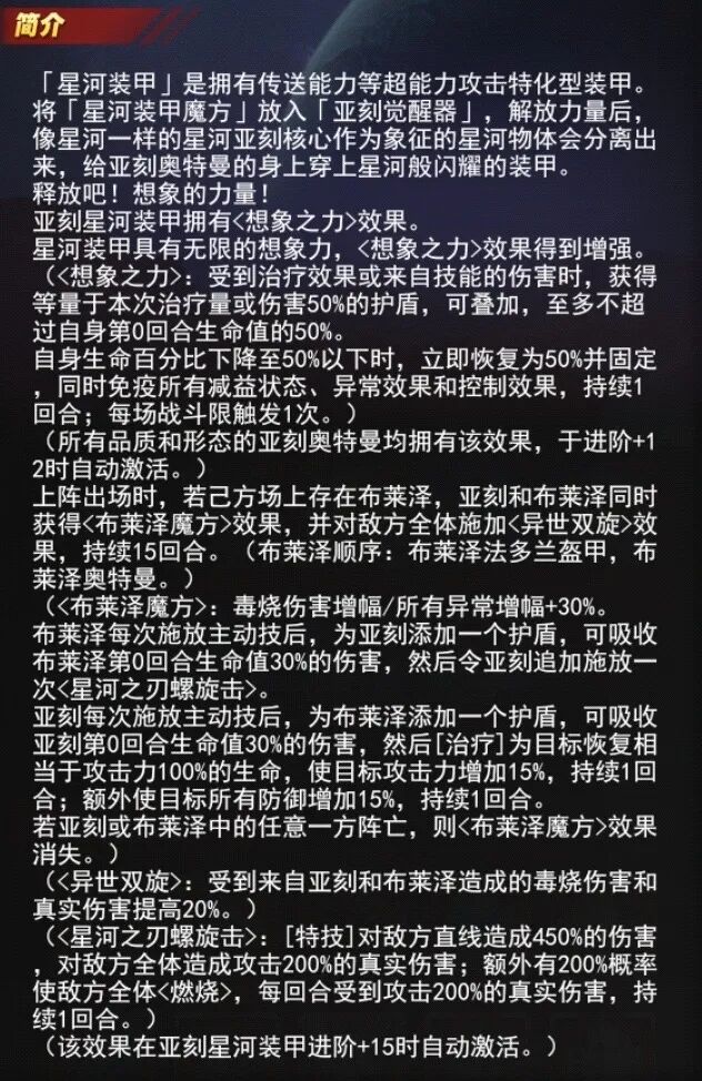 布莱泽魔方 (与布莱泽同时上场,进阶+15激活): 这是游戏中最强的二人联动效果。亚刻和布莱泽任何一方施放技能后,都会为另一方提供护盾,并触发追加攻击“星河之刃螺旋击”。这意味着亚刻和布莱泽的行动次数几乎翻倍,产生的护盾、伤害和控制(燃烧)效果源源不断。这使得亚刻和布莱泽的组合产生了1+1远大于2的化学反应,形成了一个互相保护、联动输出、无限循环的完美体系,强度远超单卡叠加。