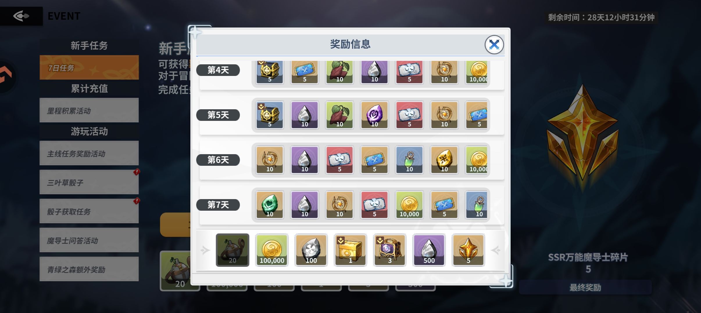 这个活动大家很熟悉了,也不用狮子多说!只要是卡牌游戏都会是会有这个开荒7日活动,主要是可以给我们送大量的资源,帮助前期的一个发育成长。
