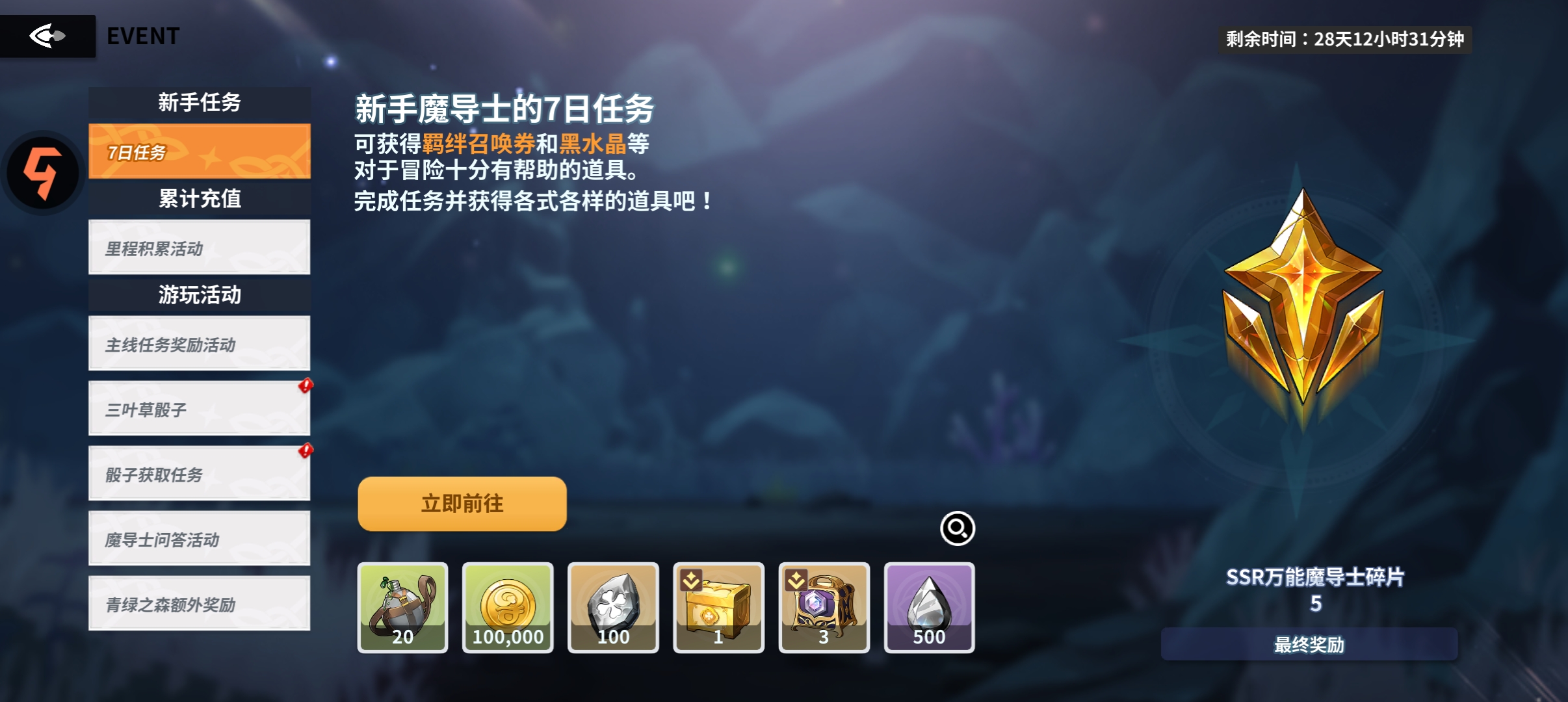 这个大家记得在活动时间内完成就行,因为可以获得核心资源:召唤卷、升阶魔石、黑水晶、技能升阶石等奖励。