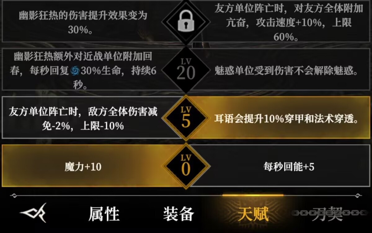 解析:这套天赋加成首先是提升了魅惑能力,魅惑期间不会被打断,同时进一步加强了给主c提升伤害的能力。