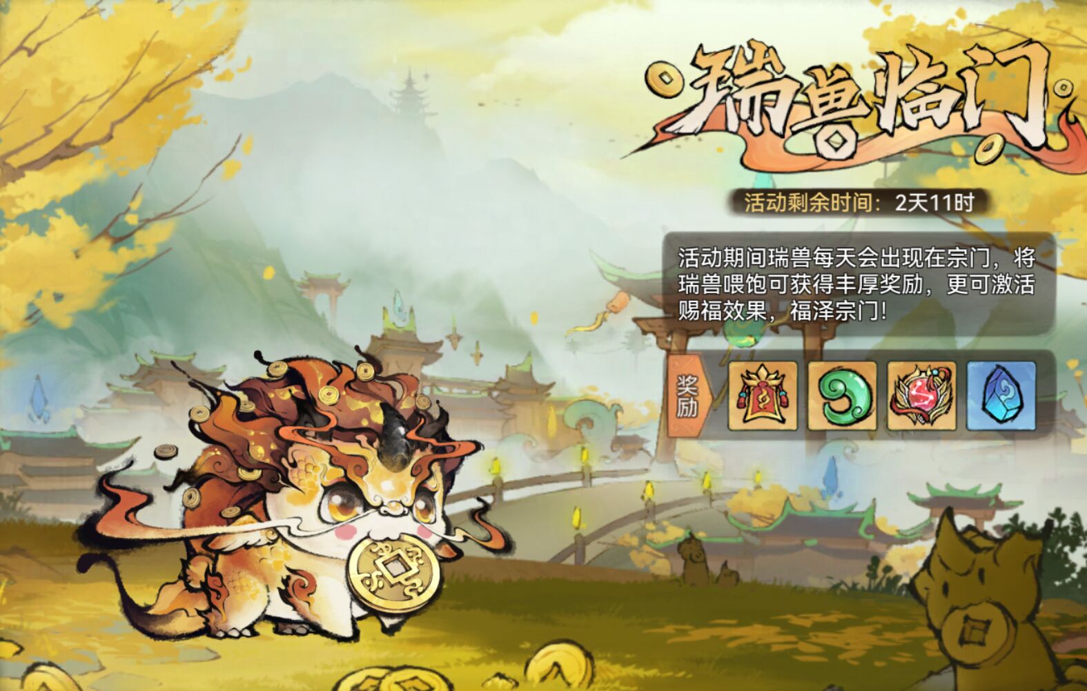 老玩家对这个瑞兽都很熟悉了,瑞兽在活动期间不定时会出现在宗门中,我们拿一些没用的材料或者去五行石喂它即可。