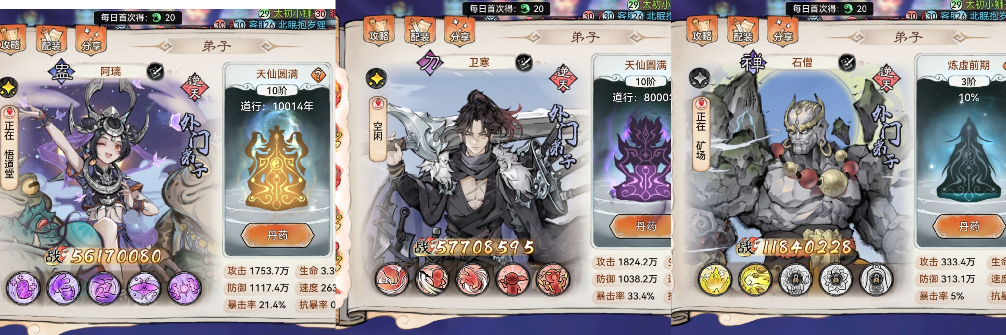 这三个都是核心输出!天命肯定越高越好了,不像辅助天命可以低一些。 ①阿璃:天命越高越高!毕竟你要用她打输出!不过红1就能用了!已经很强势了,有资源就优先拉满仙三。 ②卫寒也是一样的!红1启用!最好仙3。卫寒要求比较高,不到仙天命不是很好用, ③石头人也是一样的。