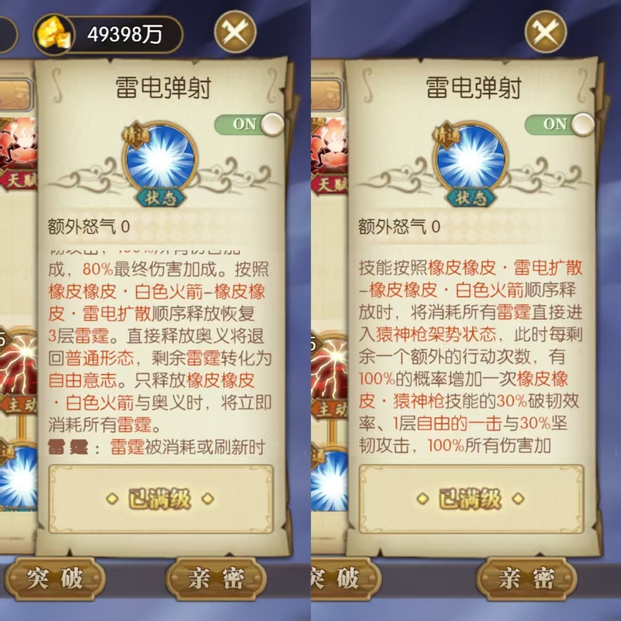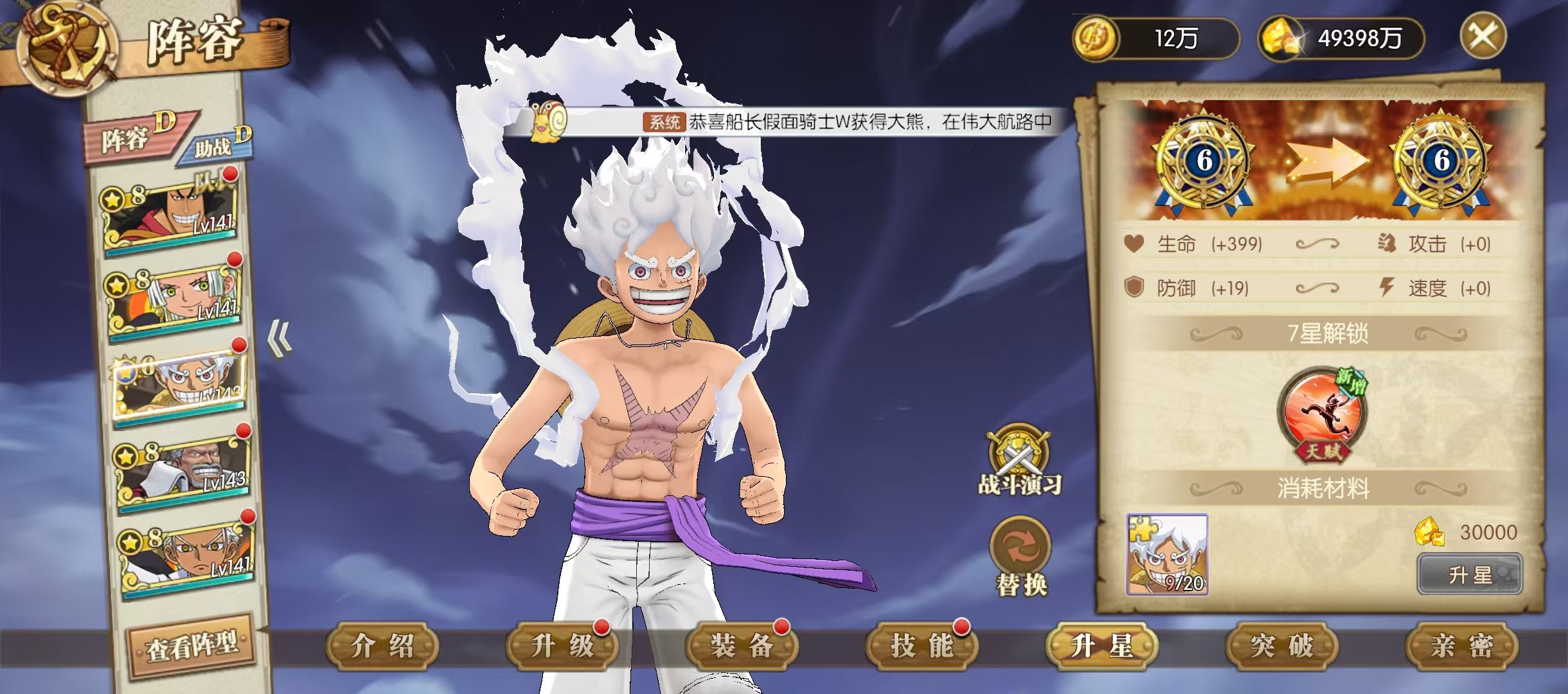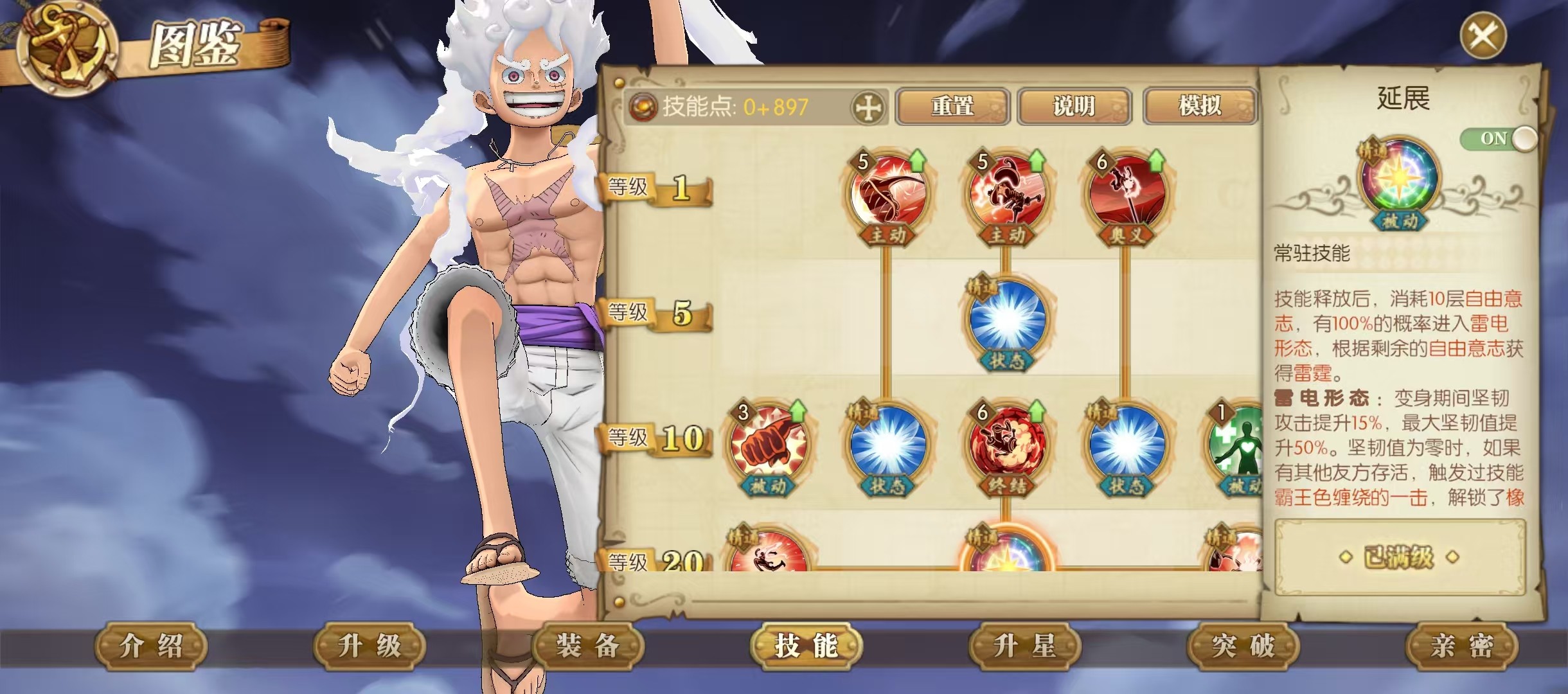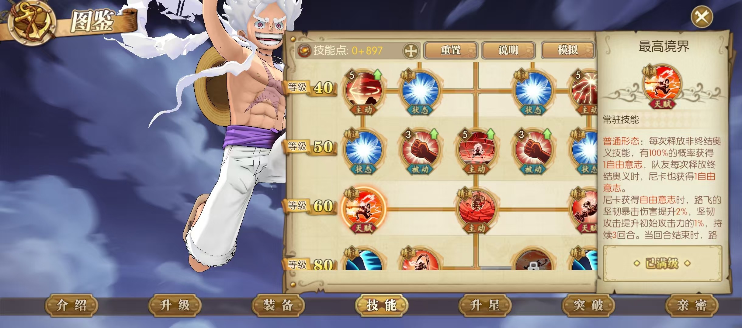 然后变身之后还有另一个比较坑的陷阱那就是这个奥义啊,这里面明确写了技能的释放顺序,如果按这个顺序放那就进入猿神枪形态了,这个形态下面需要22层自由一击才能凑出这个大招,路飞进入飞天状态看不到,只能看到队友动,然后队友动了之后给路飞叠这个自由一击。