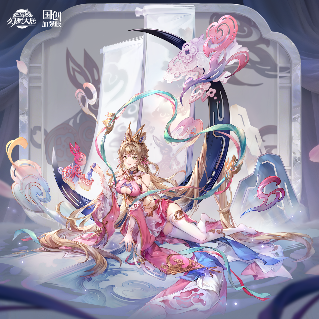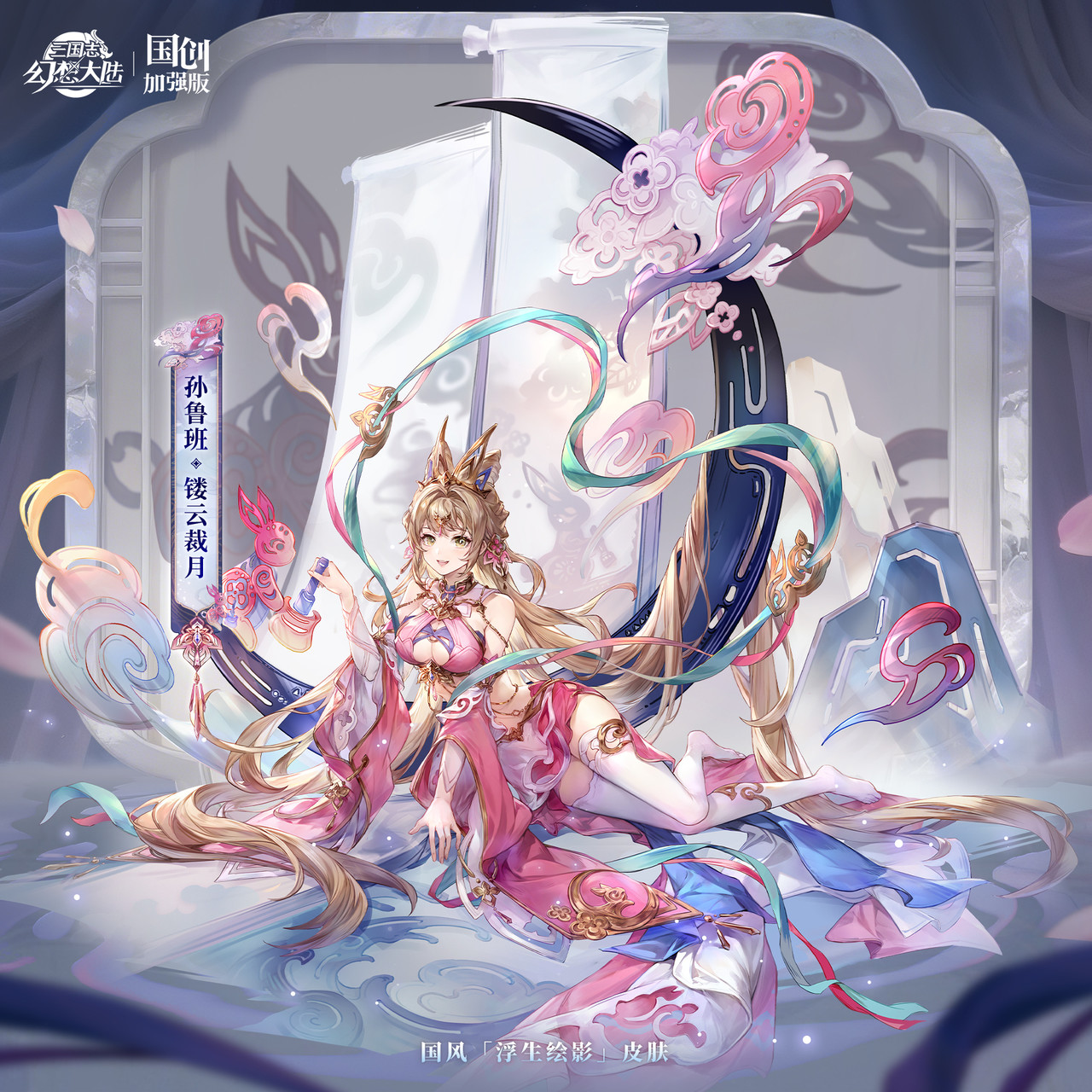 本次皮肤灵感源自皮影戏,孙鲁班扮演玉兔进行演出,展现了传统皮影文化的独特魅力。她的发髻巧妙地模仿了玉兔的耳朵,粉色衣裙上无论是剪裁还是配饰,都巧妙融入了玉兔与月亮的元素。此刻,她一手持捣月工具,另一只手轻触地面的光影,仿佛在精心调整演出效果。而她身后悬挂着一轮月牙,其上点缀着片片祥云,不仅色彩与整体造型相得益彰,更完美呼应了“镂云裁月”的主题。