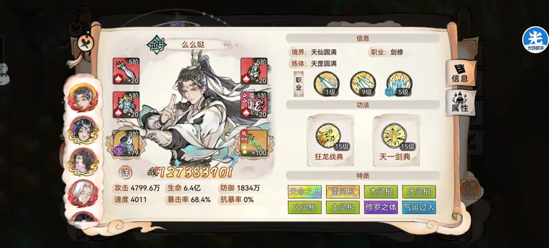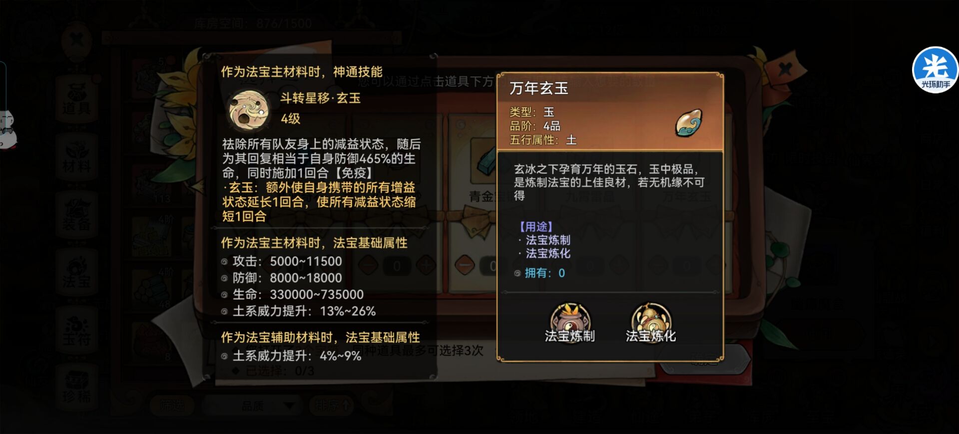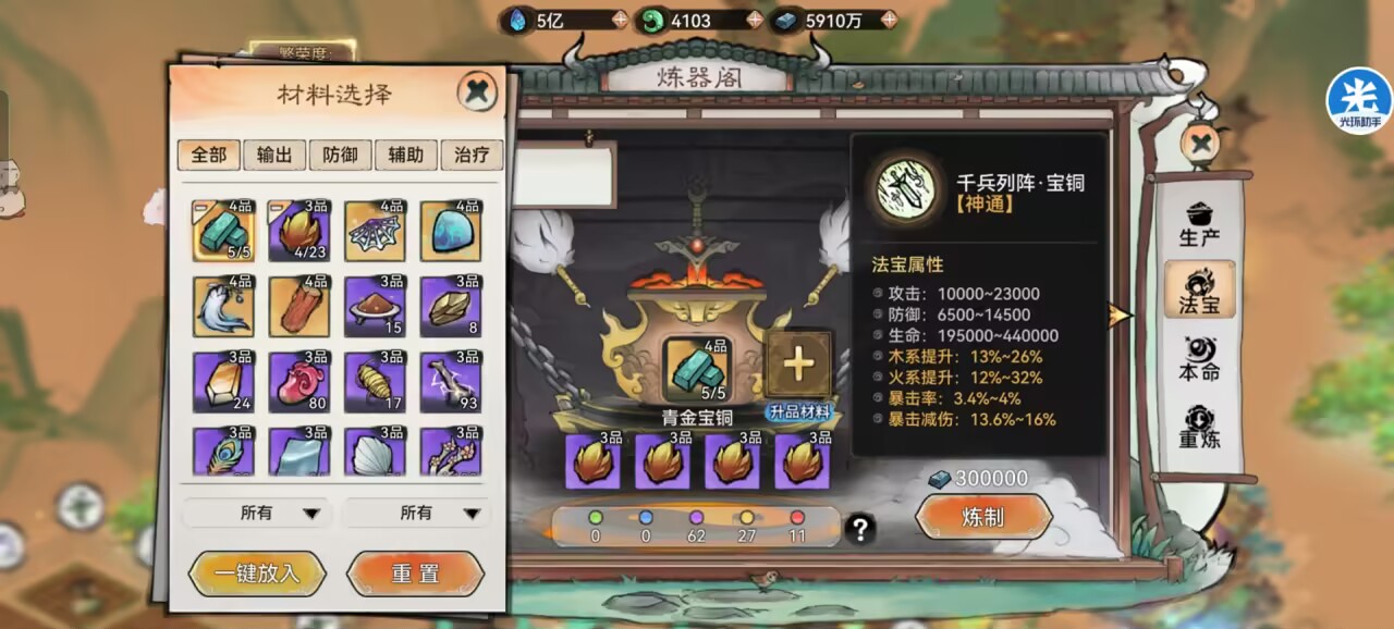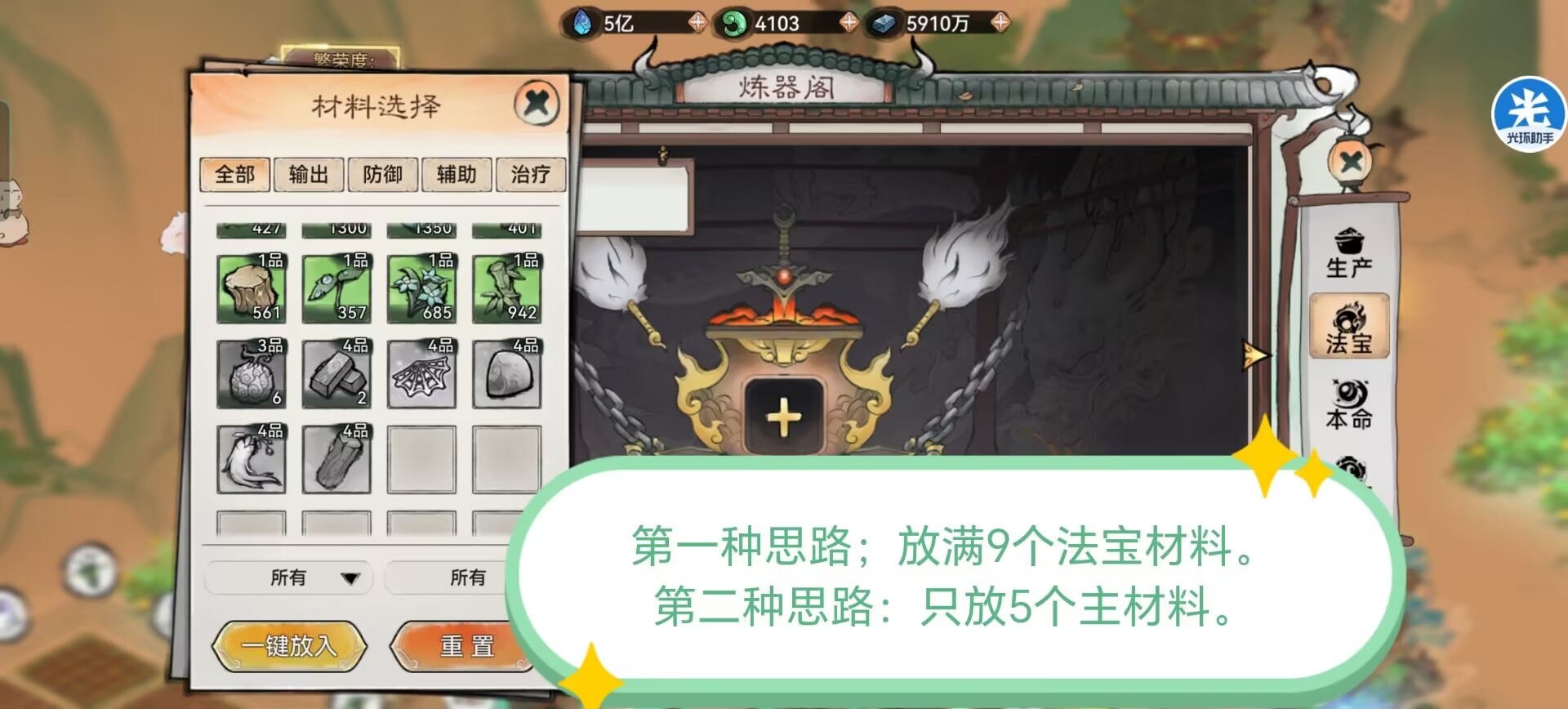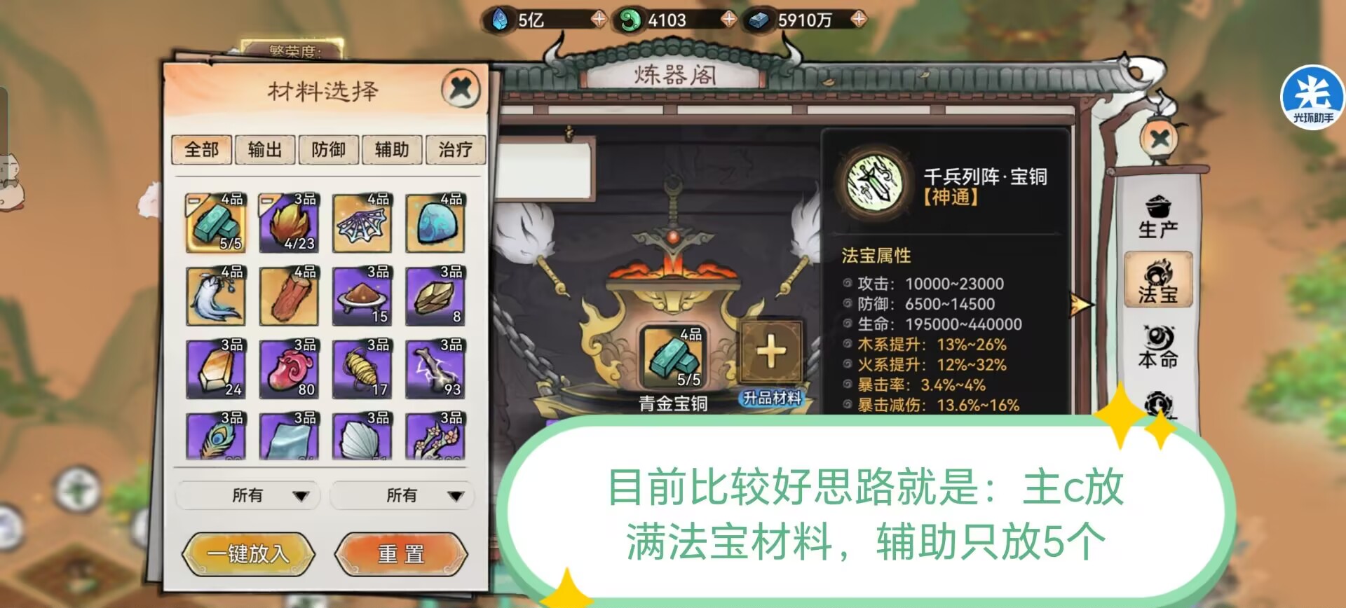 那么有没有鱼和熊掌兼得的办法呢?目前的最好的思路就是:主c和副c可以放9个四阶法宝炼化,其他的辅助坦克都只放5个法宝材料炼化。