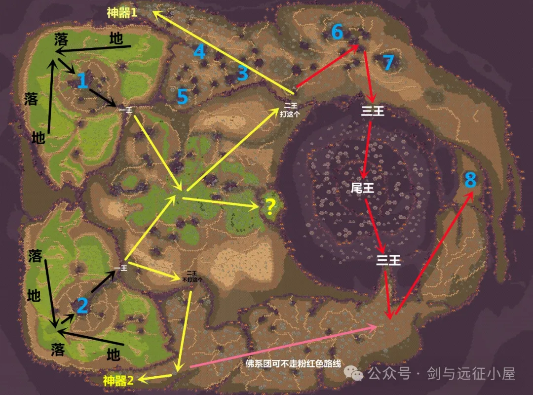 阶段三:上路拿上面的(黄点)神器,下路破二王守卫后拿下面的(黄点)神器,三神器收集完毕