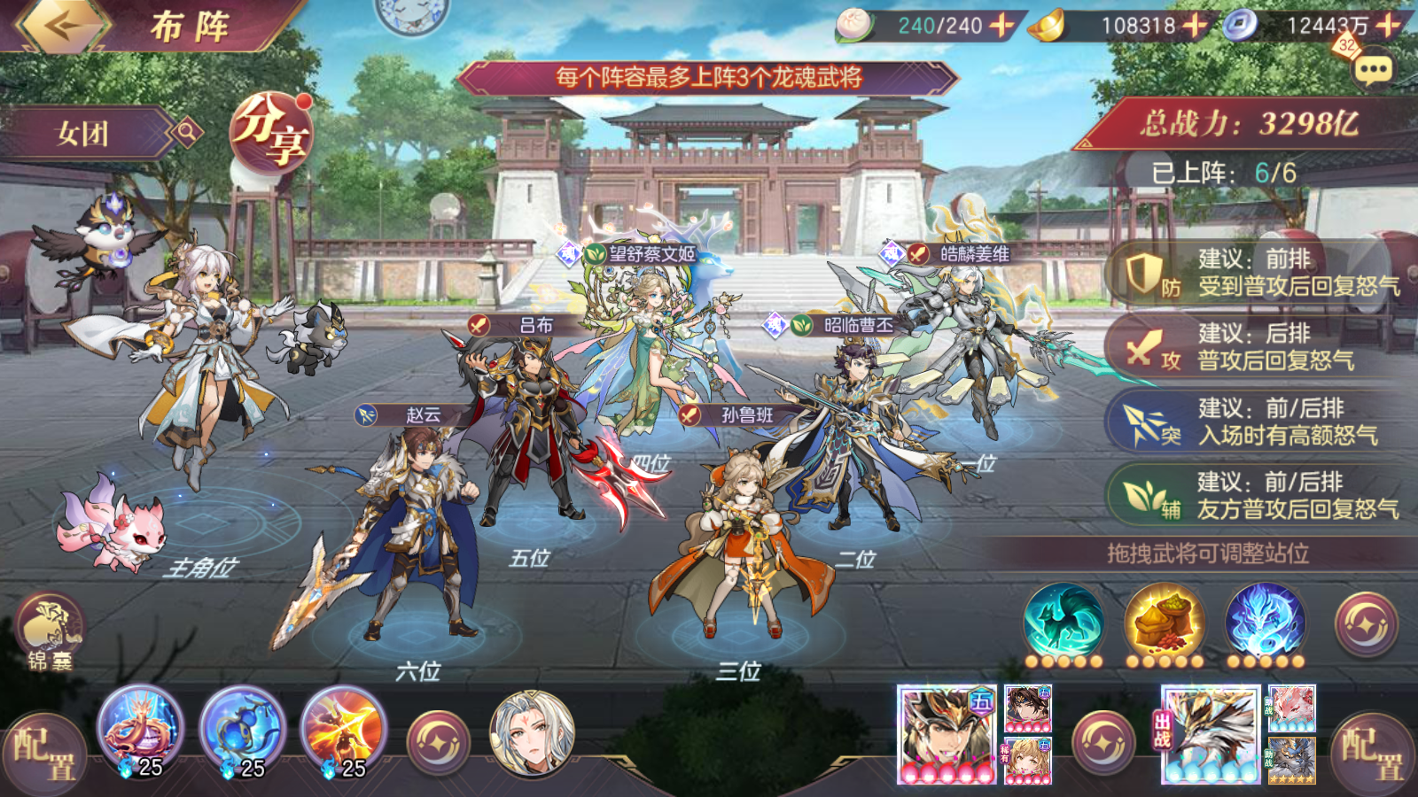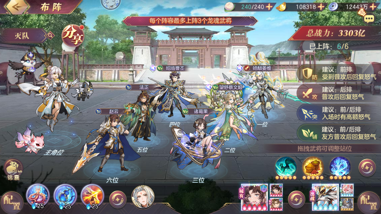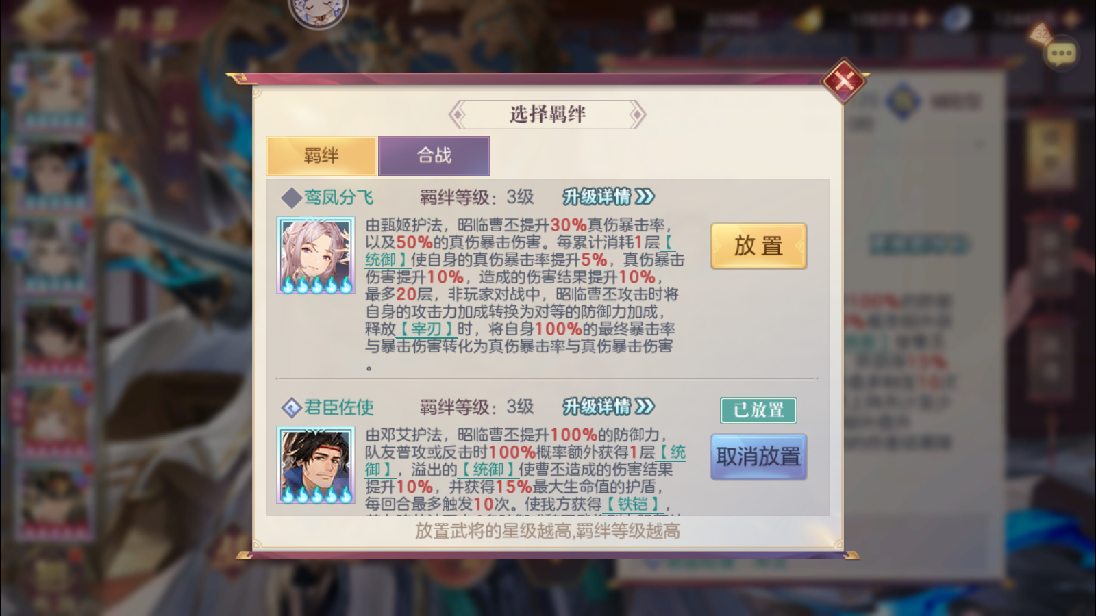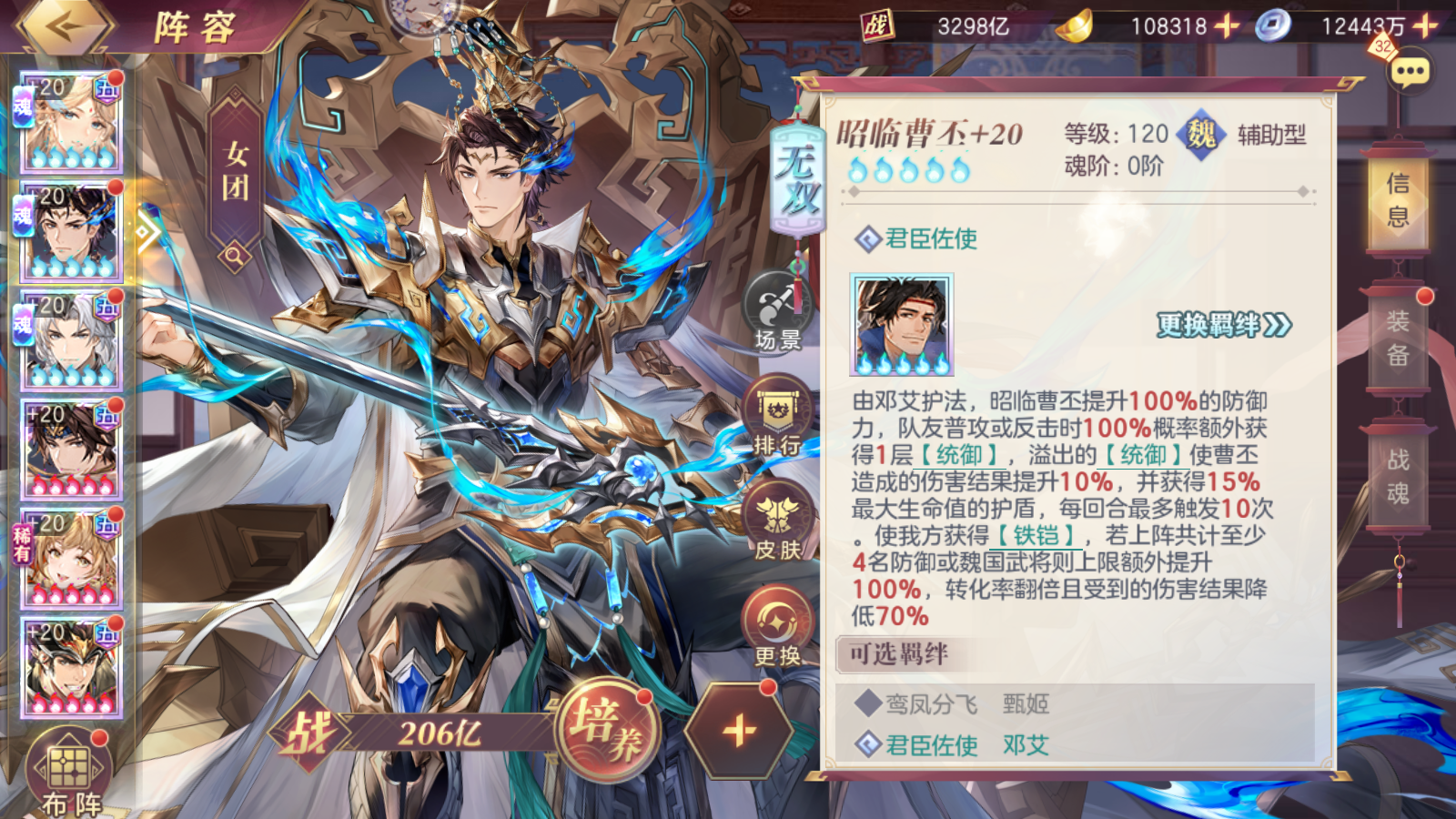 ②启用星级:楼主拿两个号测试以后发现,0火即可使用,蜀队将命魂吕布换成0火曹丕以后,带曹丕的阵容基本上吊打没曹丕的,0火都有较高概率越战没带曹丕的蜀队几百亿,其次就是3火曹丕打1火,5火曹丕打3火曹丕都有着相当不错的表现,简单来说就是升火提升大。
