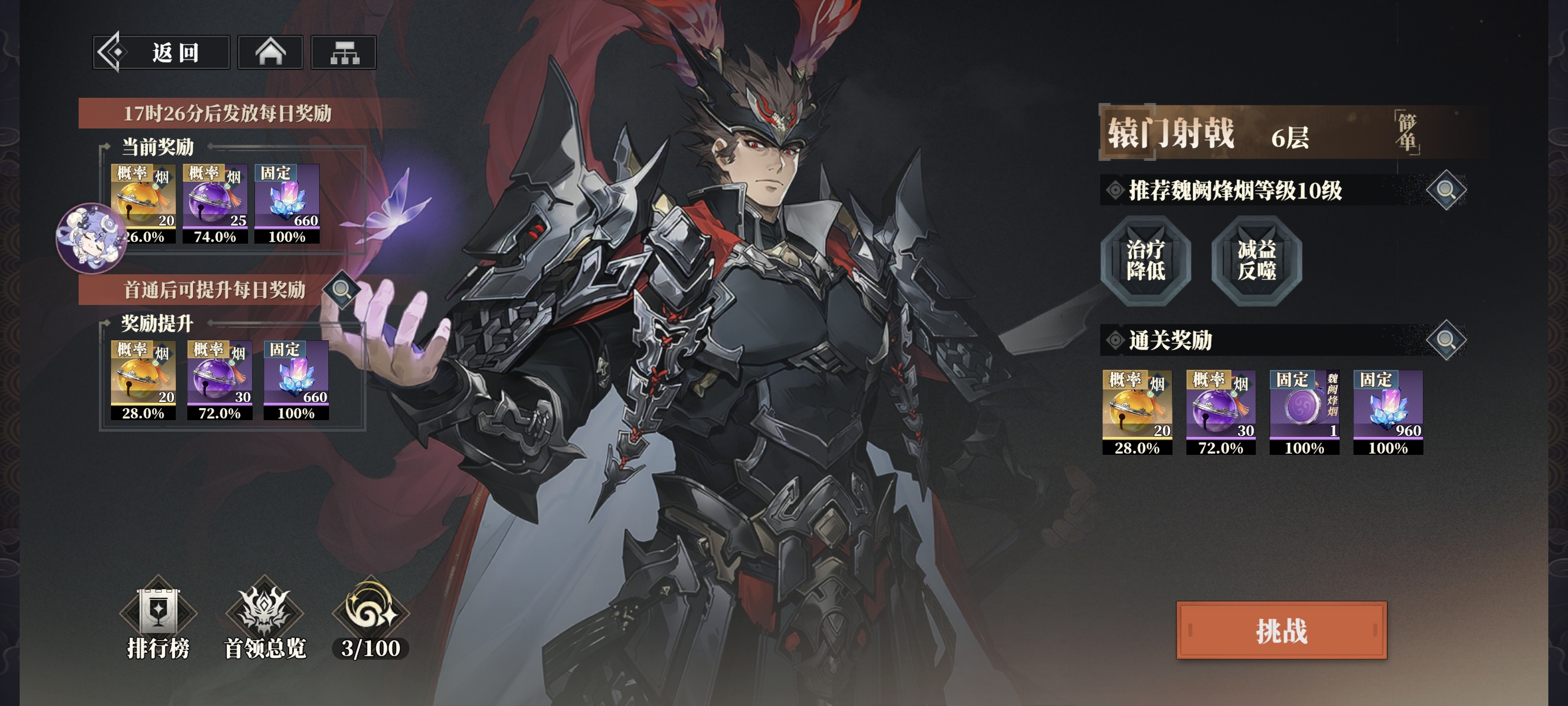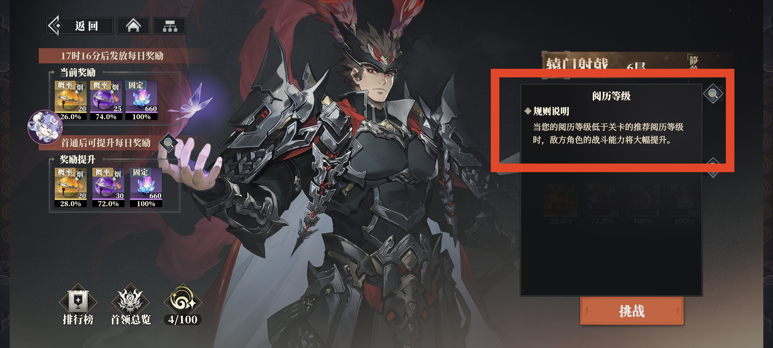 *挑战难度和主线阅历等级相关,阅历等级相差越大难度越高。阅历等级可通过通关主线关卡后挂机提升。