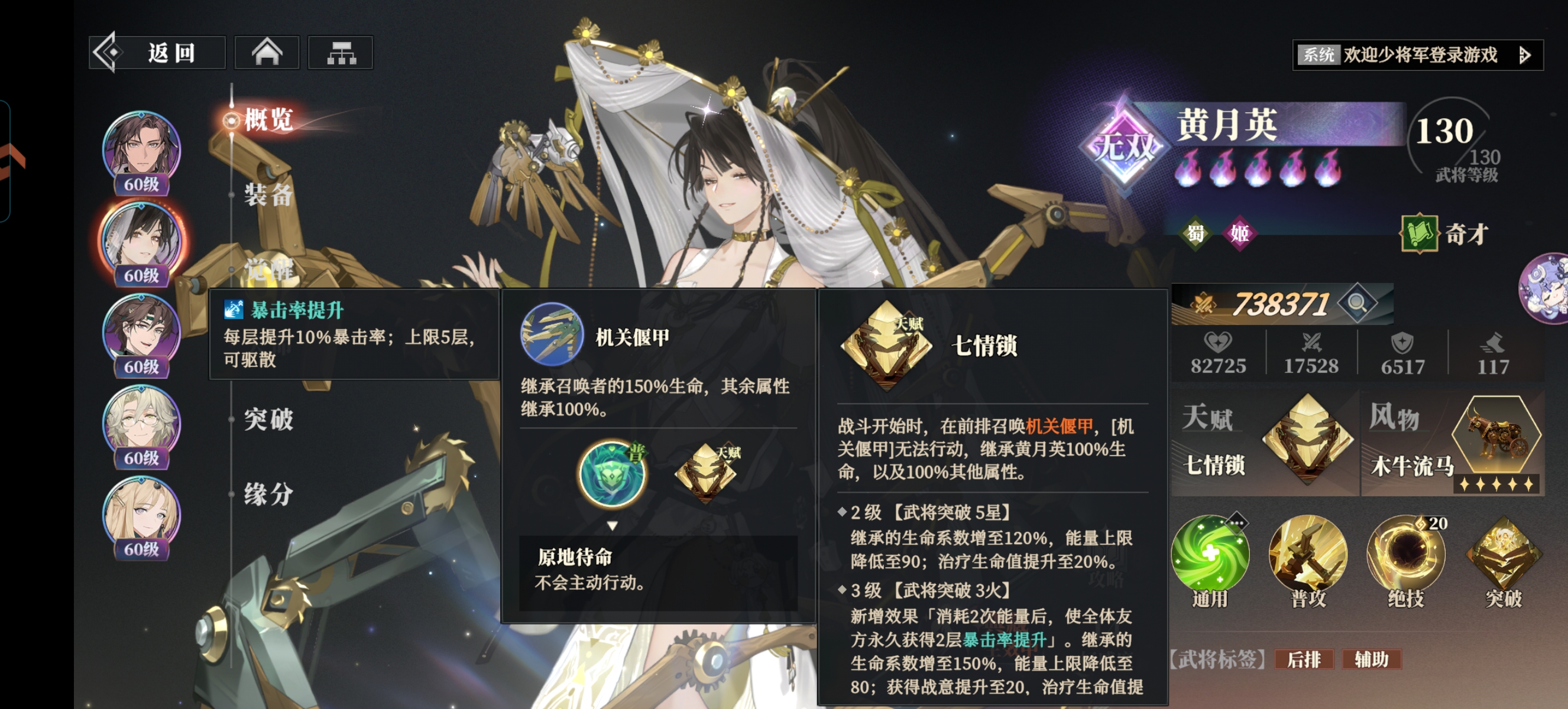 ⭐同时黄月英达到3火以后:《偃甲》消耗2次能量还可以永久提升:全体队友的暴击率。