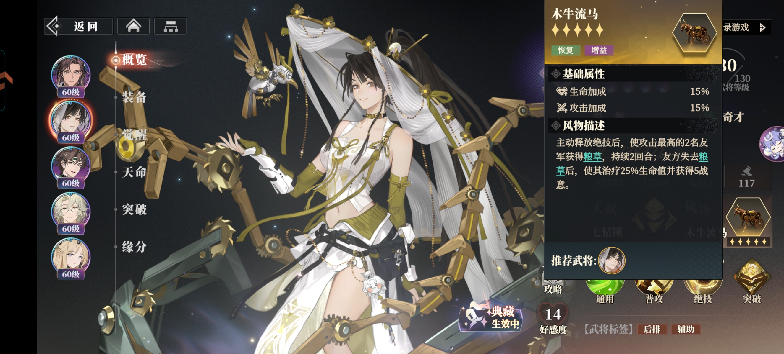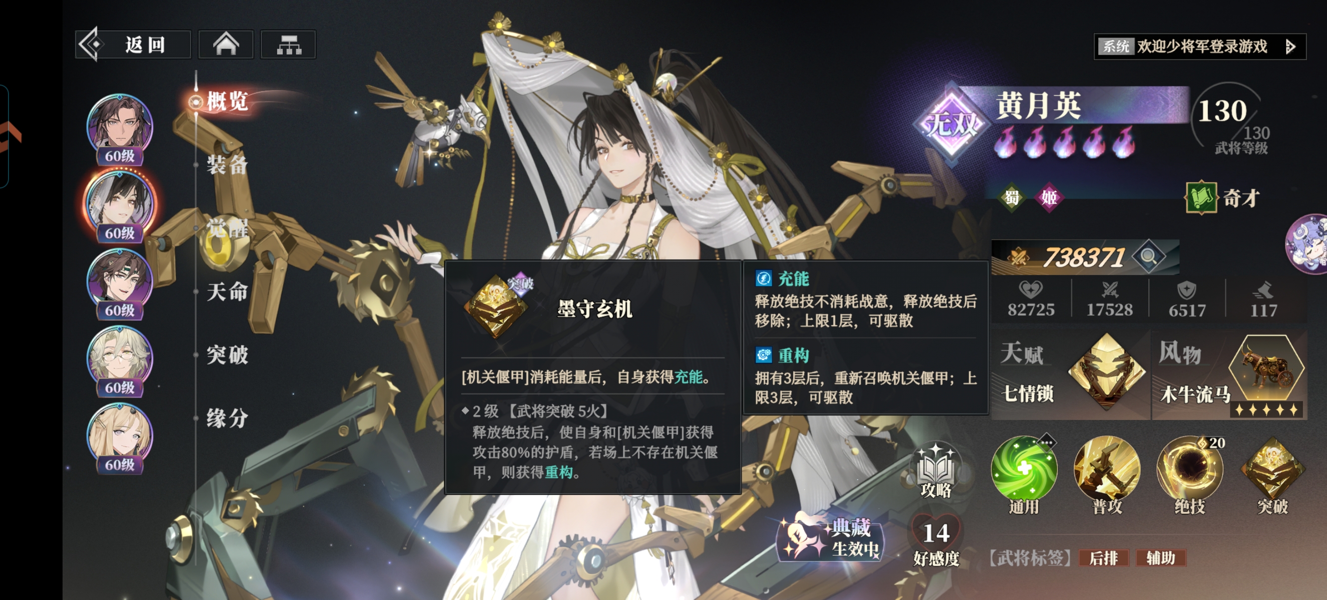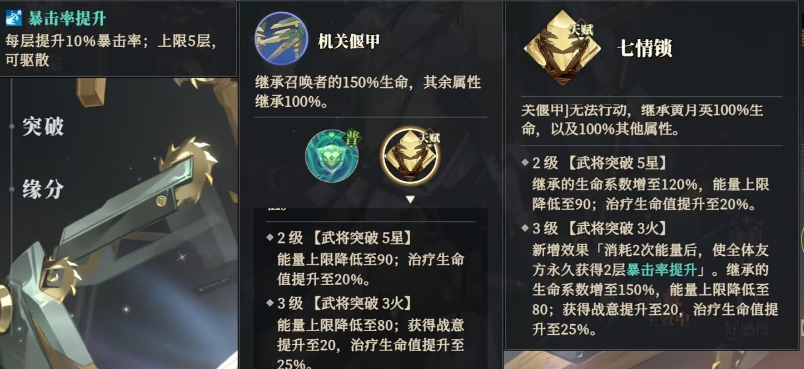 ②机关偃甲:最大可以继承黄月英本体:150%生命和100%的其他属性值,如果5火的黄云英释放绝技以后还可以给偃甲提供护盾保护。