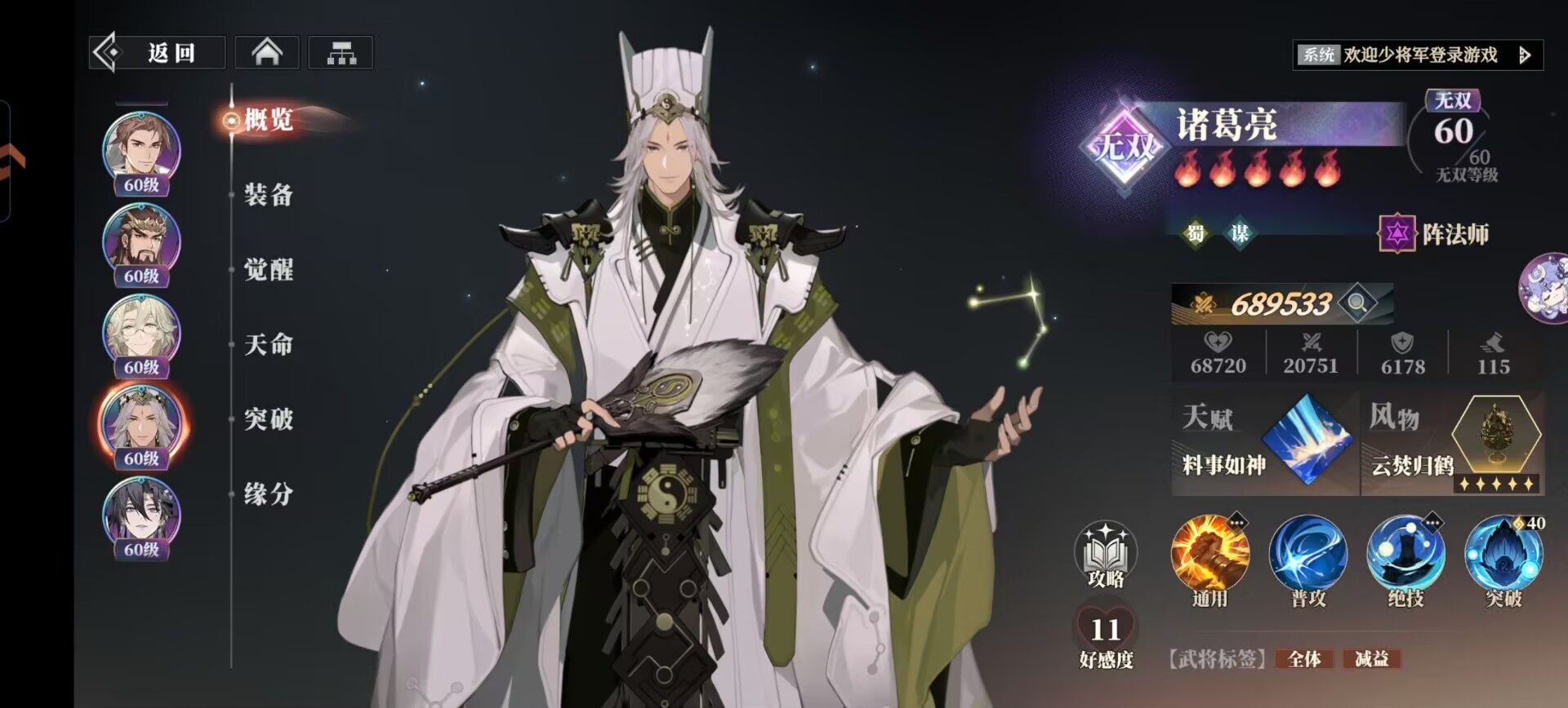 比如说:我们蜀国【诸葛亮】大招=40战意。