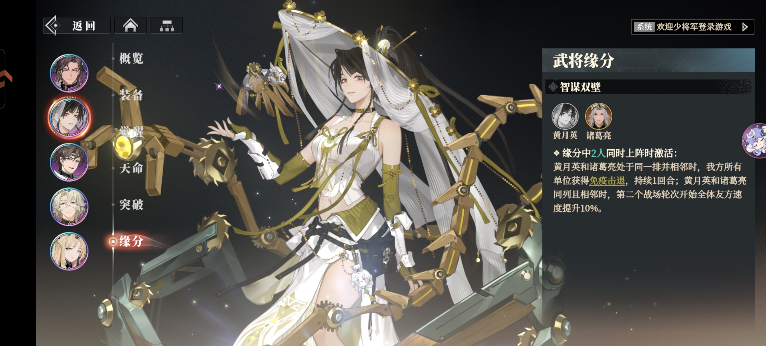 ①黄月英缘分名叫:【智谋双壁】。