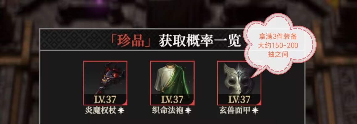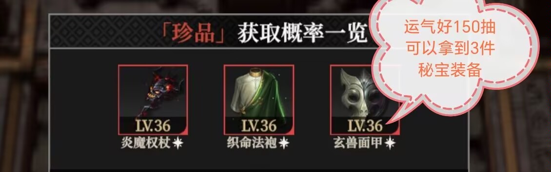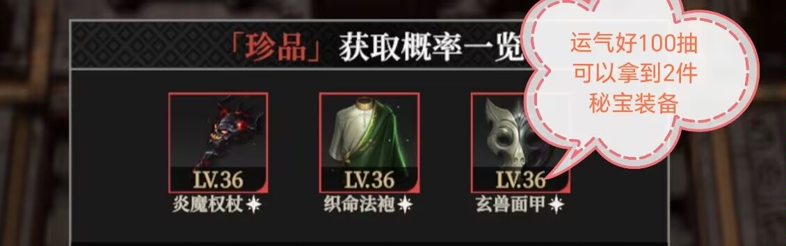 但是如果只考虑拿秘宝装备的话,就不需要囤那么多抽!基本上150抽—200抽左右可以拿满3个秘宝装备。