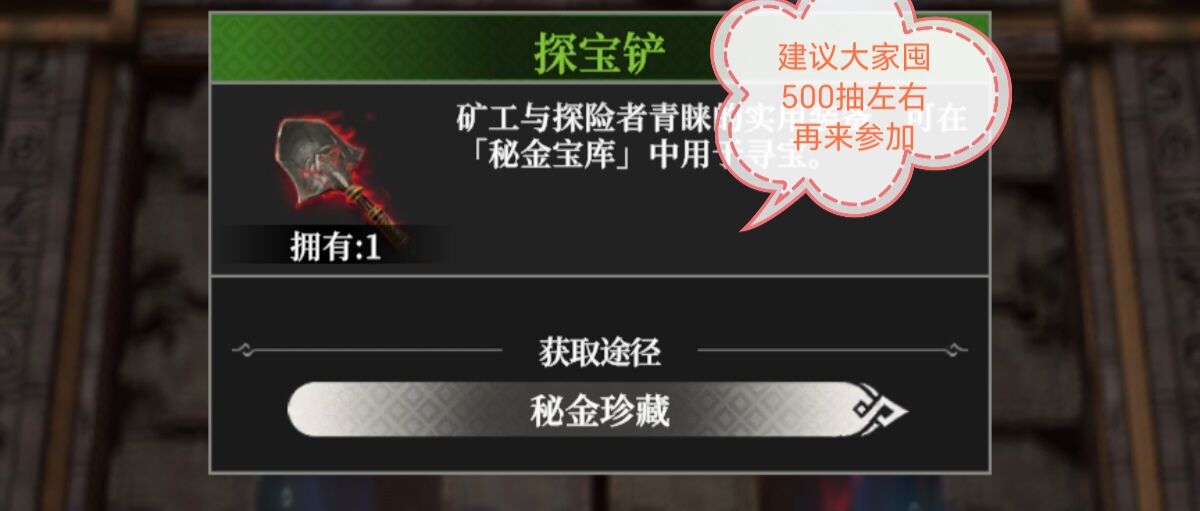 二:【秘金铸宫】详细活动参与建议:答:推荐大家多囤点【探宝铲】再来参加。