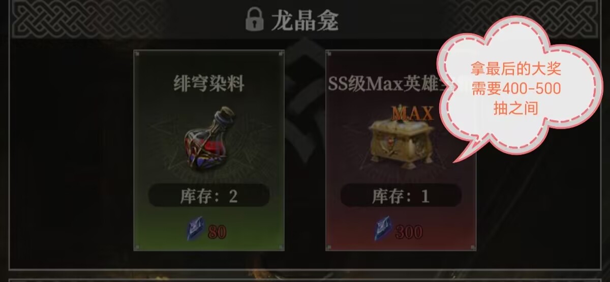狮子计算了一下:按照最低标准来算拿到:【ss级max英雄宝箱】=433个虚晶。大约就是需要500抽左右!可能运气好一点400多抽足够。