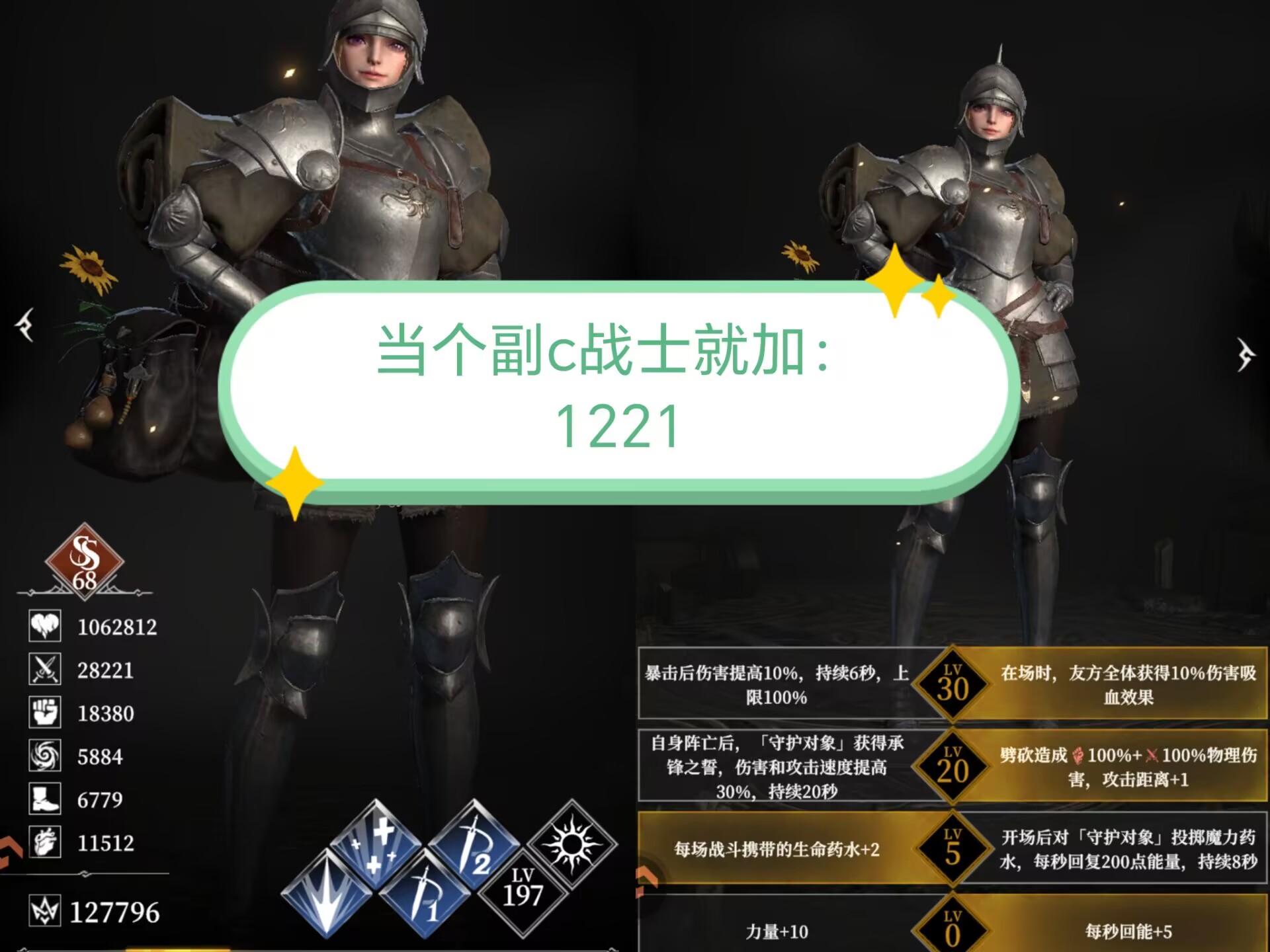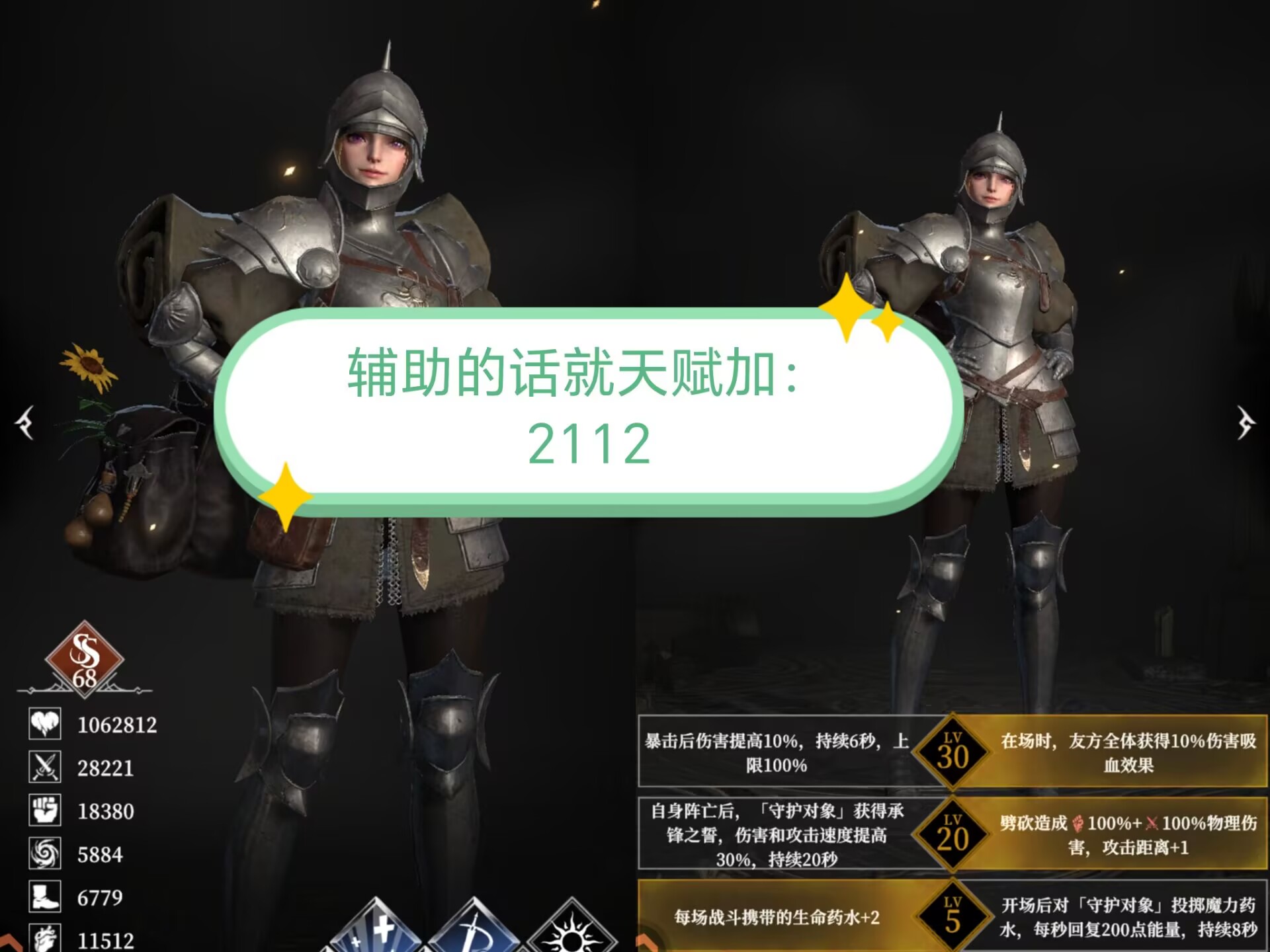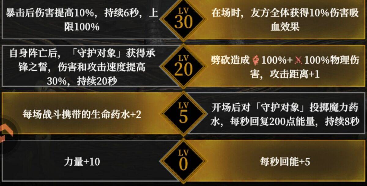解析:这样加点开局就可以提升全体队友的10%吸血,并且可以让生命药水的数量加2瓶,更好的保护守护对象,同时自身死亡以后可以让守护对象的攻击和伤害提升30%,极大提升自己的辅助能力。