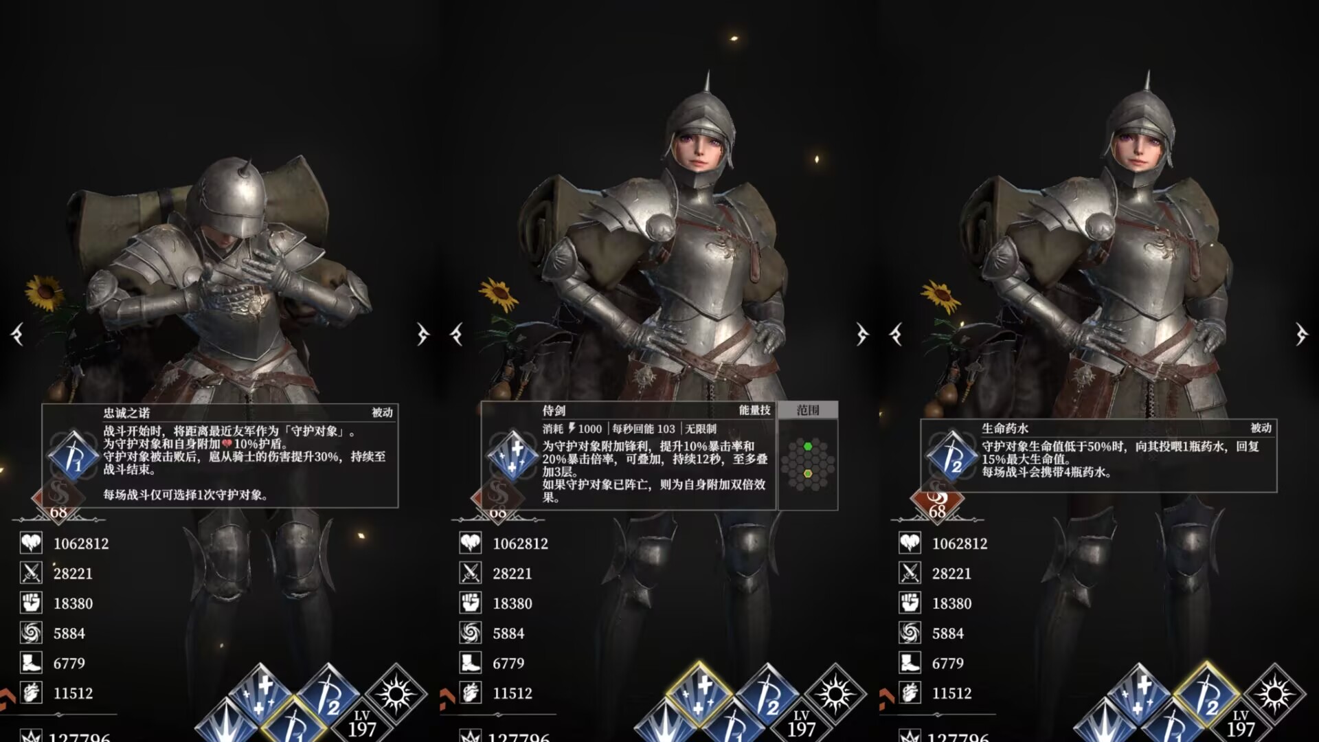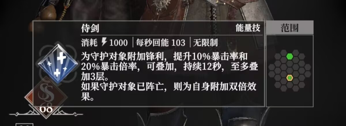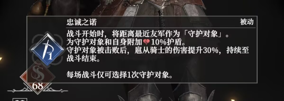 总结:扈从骑士释放能量技的时候,可以守护其中距离最近的1名队友为其附加【锋利】。