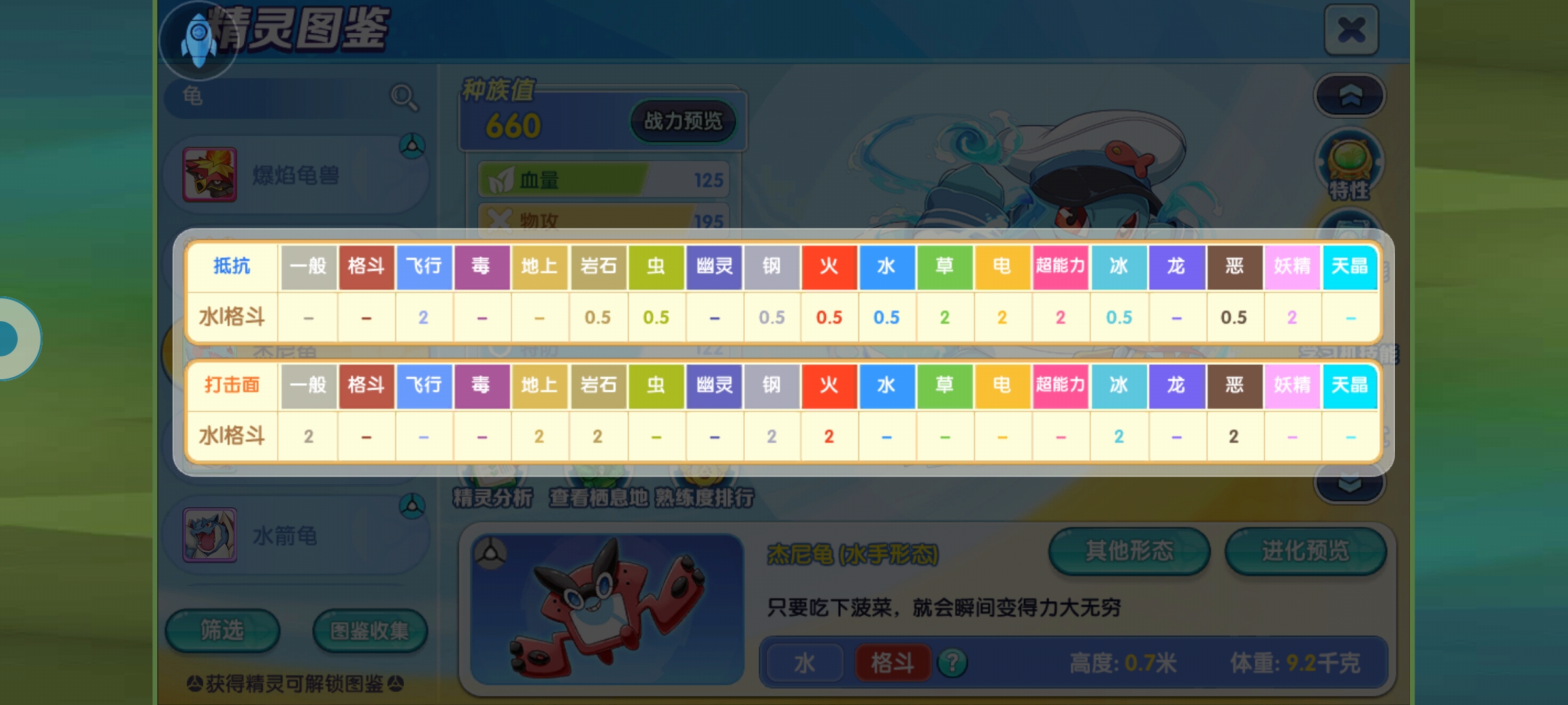 水格斗双属性让大力水手杰尼龟获得不错的抗性,只弱热门属性有:飞,草,电,妖,超能,抵抗热门属性有:冰,恶,水,岩,以及抵抗非热门属性有:虫,其它属性效果皆一般。