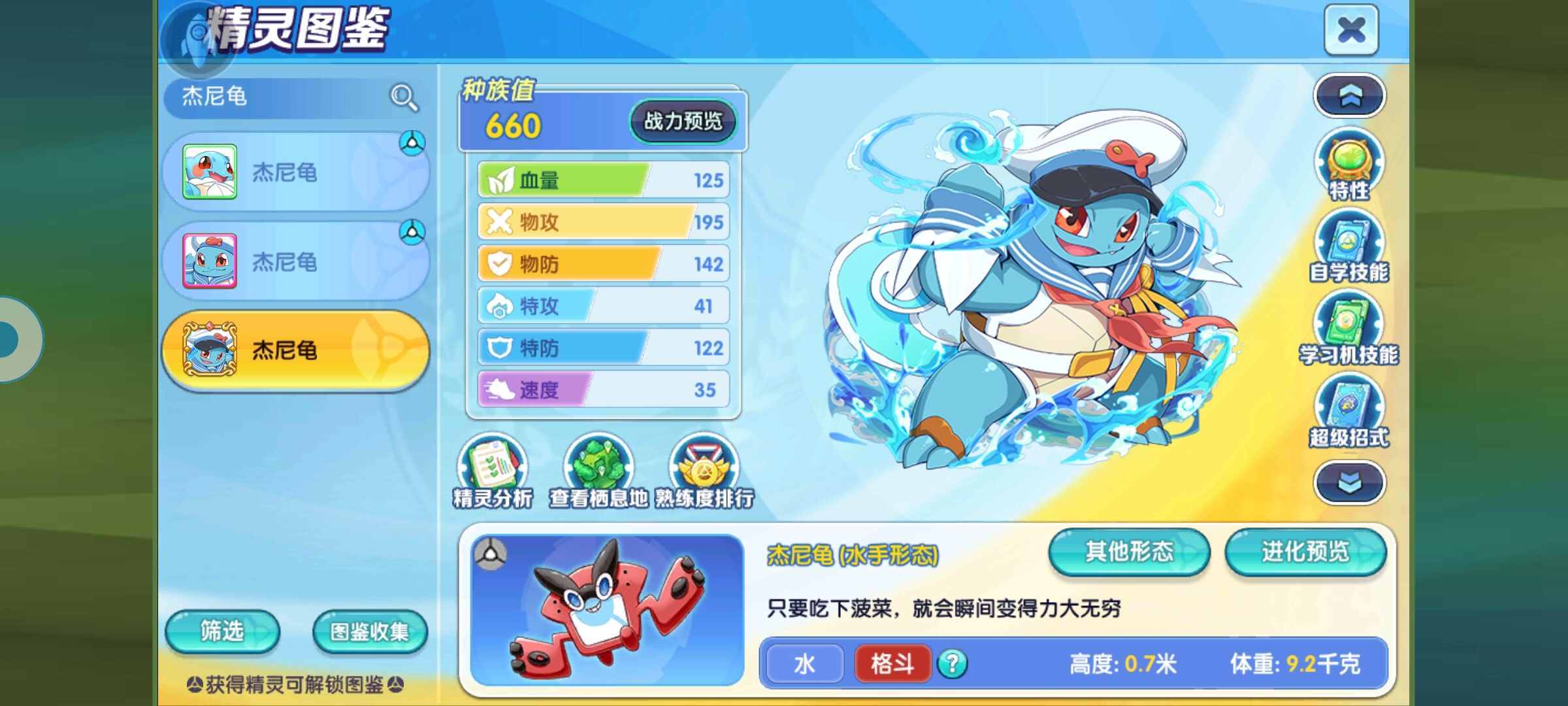 从大力水手杰尼龟的种族值来看,其中强力的物攻值挤进一等,而血量物防特防都不是很强力,让大力水手杰尼龟在PVP中想要获得了不俗的生存能力必须依赖特性,经过我PVP中发现,最终定位,仍是骗术爆发物攻手。