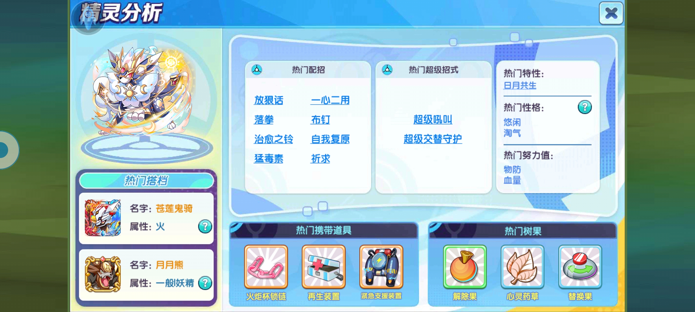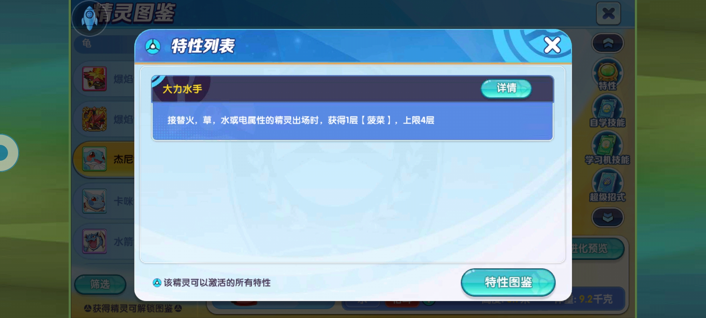 大力水手特性,接替火,草,水或电属性的精灵出场时,获得1层【菠菜】,上限4层。接替拥有上述2种或以上的属性精灵的时候,可以一次获得多层【菠菜】,菠菜让受到伤害降低50%,使用火焰拳,雷光掌,急冻拳,鱼跃龙门技能攻击时消耗1层【菠菜】进行强化,使这些技能拥有属性一致加成且威力提高100%,而且增加1单属性克制倍率。