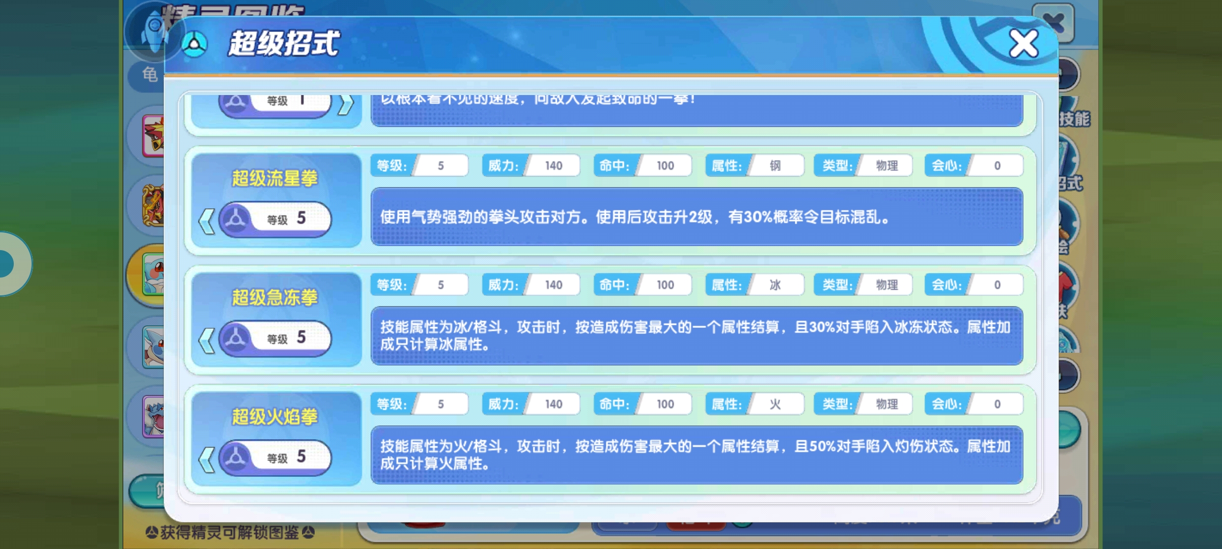 大力水手杰尼龟的超级招式有5个 ,除了普通双本,其他都各有好处,其中有钢、冰、火系,钢可以提升输出强度,也可以补充打击面,火和冰可以有概率给对方施加状态。