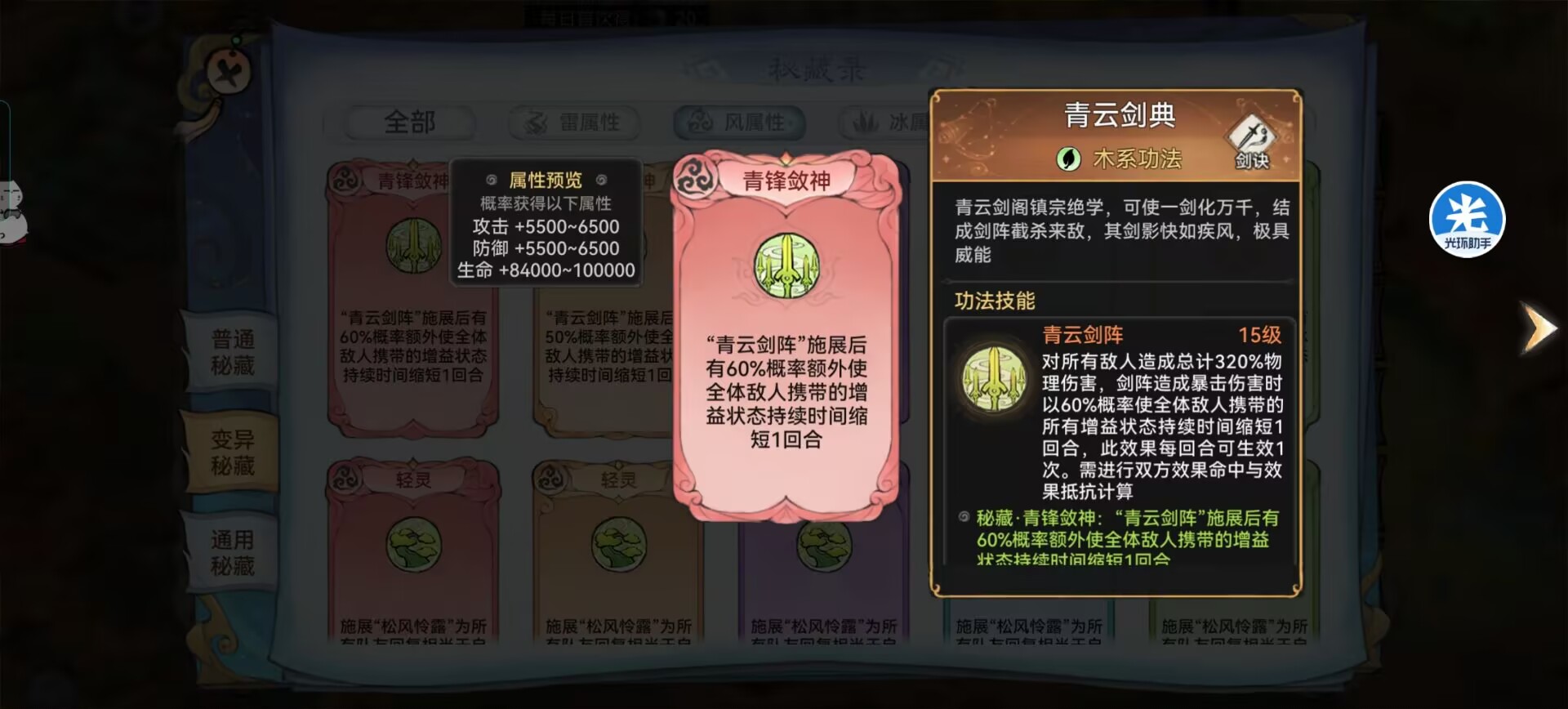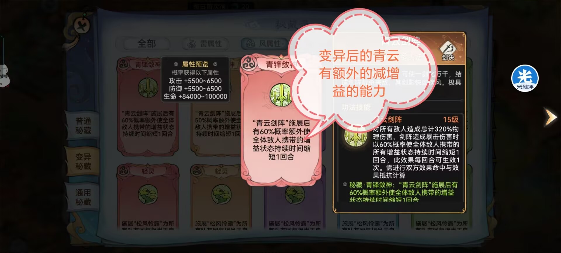 ①变异后的青云剑典:主要就是额外有60%让敌人的增益缩短1回合。