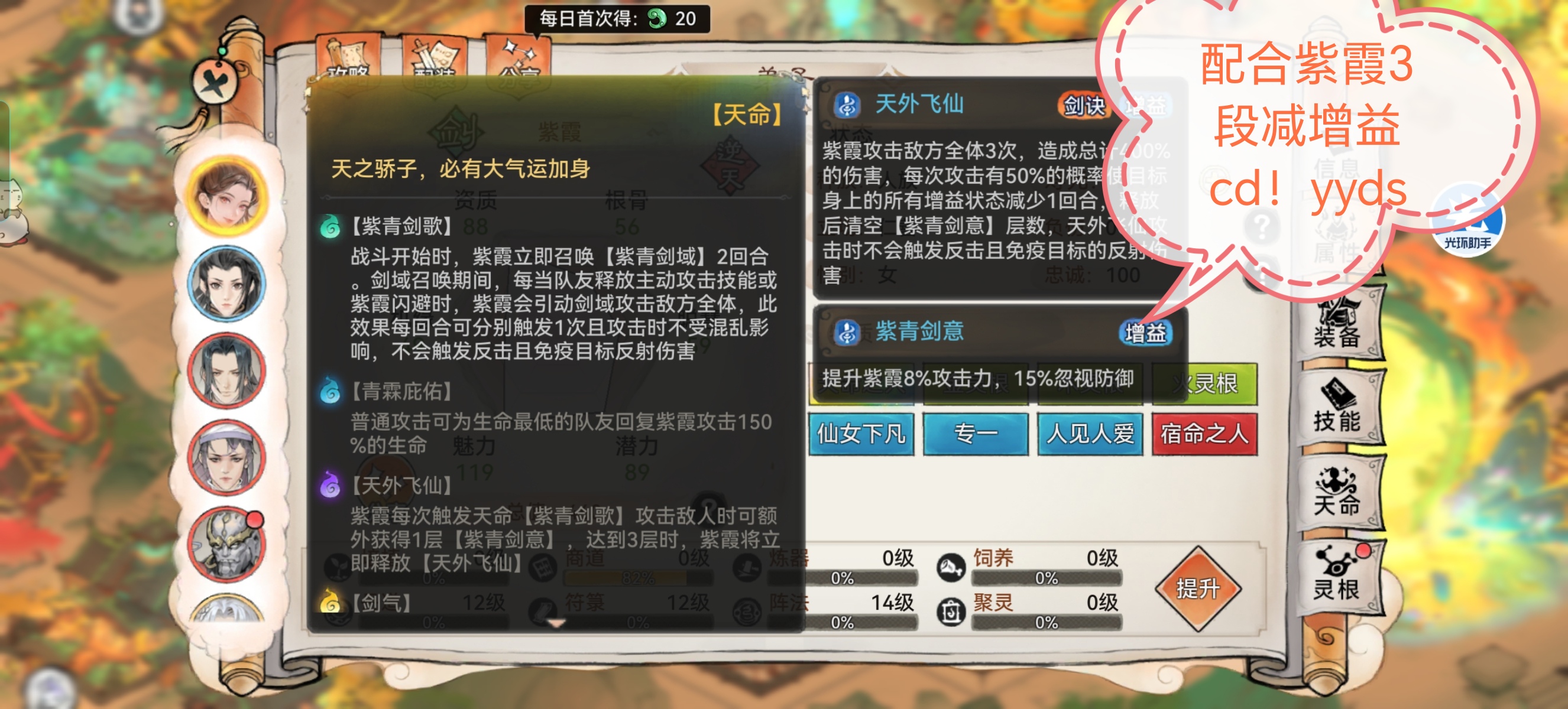 配合上紫霞的剑诀【天外飞仙】3段减增益回合的效果直接让敌方感受下超级减增益的威力,让敌人增益都挂不住。