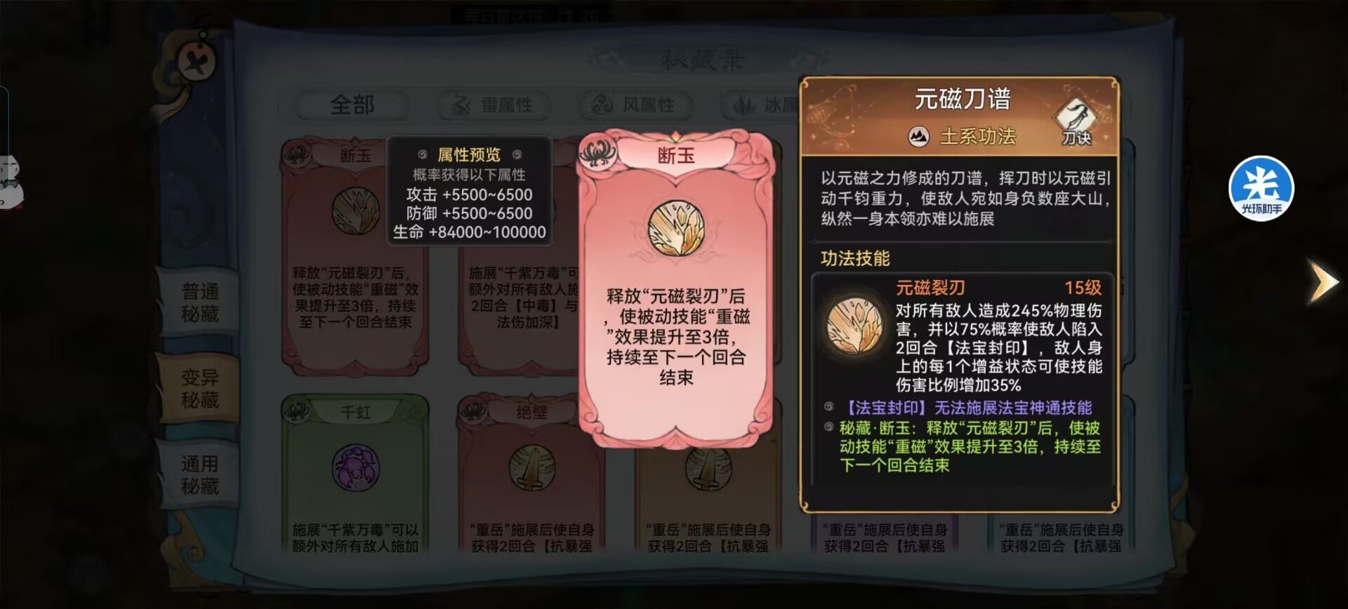 ③另外就是元磁刀谱这本功法,本身也不是什么核心的输出功法,比较冷门,伤害倍率很低主要机制就是封印法宝,变异后也没有提升伤害,靠这本功法打伤害也是无稽之谈。