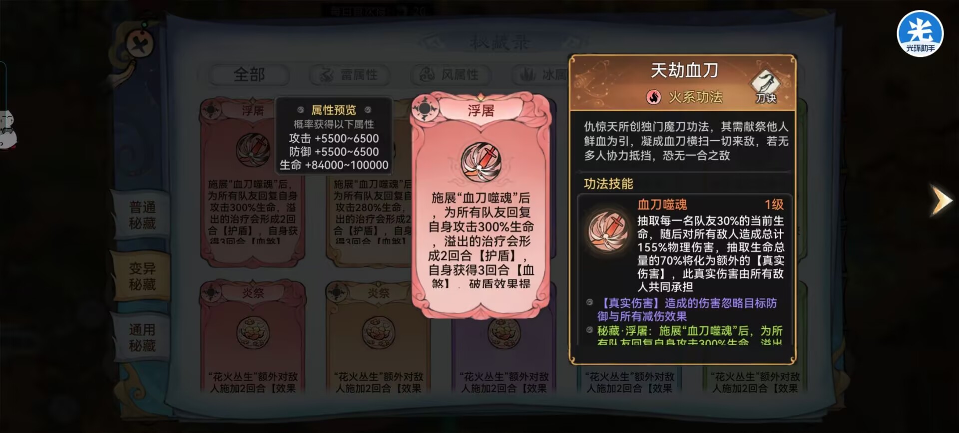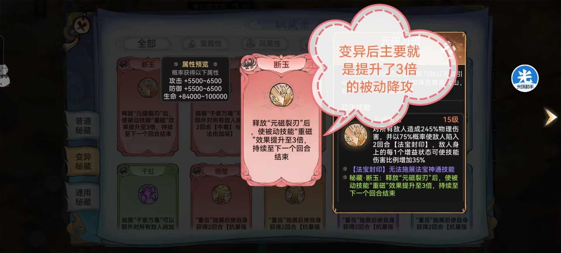 另外变异后伤害还是很低!所以这本功法不值得大家去花几百个妖晶变异。