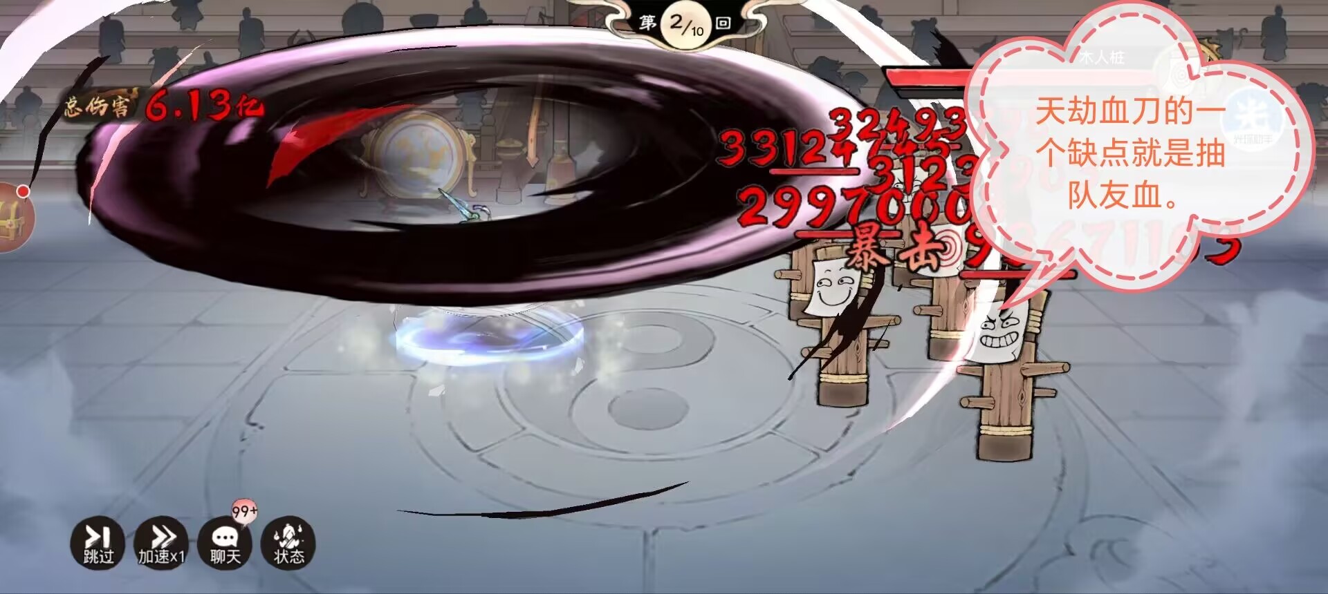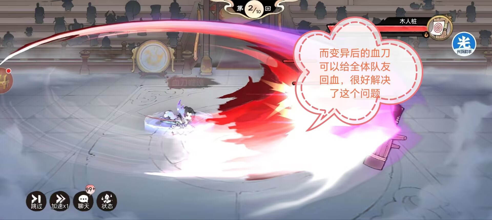 ②我们知道天劫血刀是需要抽队友大量的生命来打伤害的,没有变异前的血刀是没有治疗能力的,而变异后的血刀在抽取队友的血的同时还可以给他们回血,很高解决了抽队友生命的缺点之一。