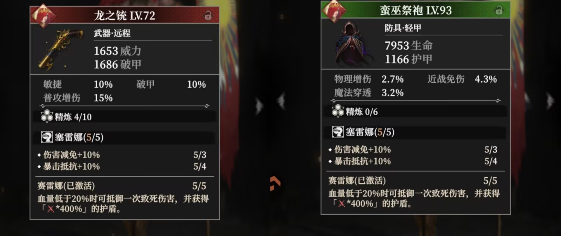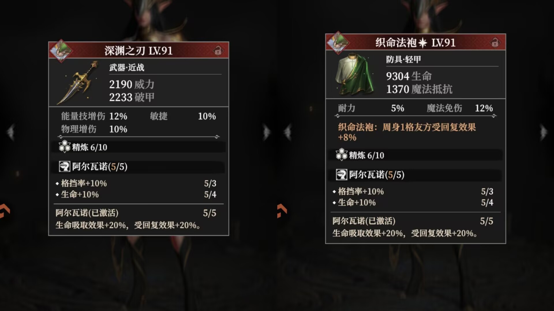 套装属性还可以提升生命和格挡率。