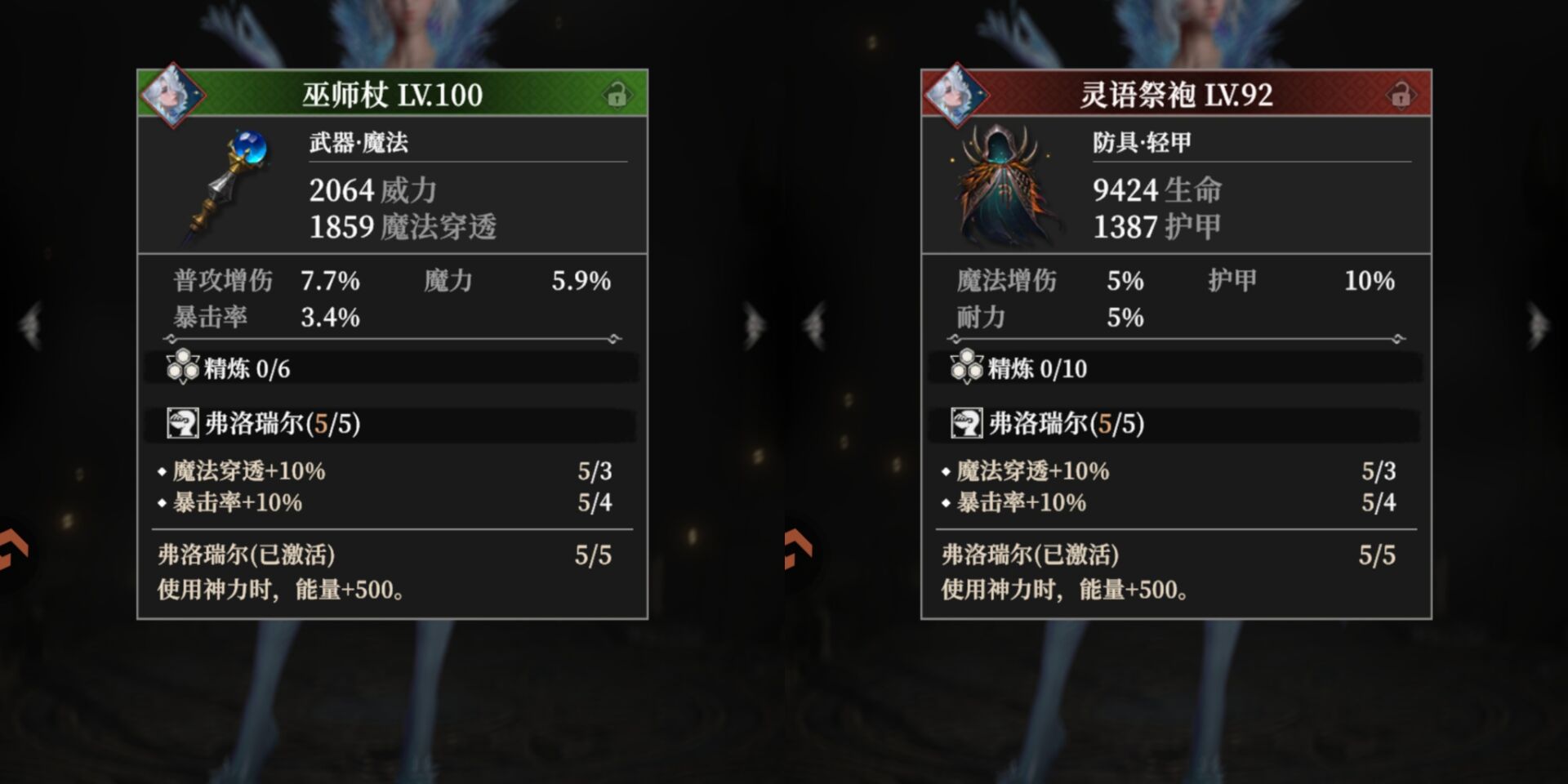 5件套激活后:只要使用神力,就可以回500点能量套装属性有提升:暴击、法穿、威力等加成。
