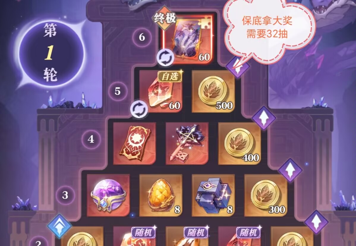 那么有玩家会问了:按保底机制来算的话,多少抽可以拿到终极大奖?答:按保底算的话1轮大奖=32抽(实际上运气好的话会低于32抽)。
