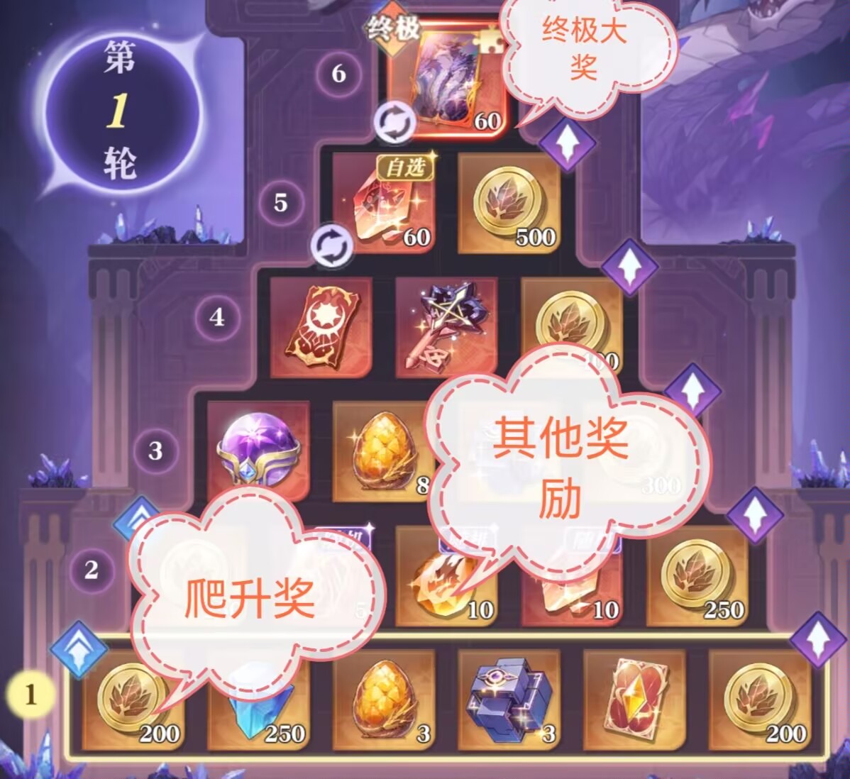 ②每轮都有6层奖励:抽到爬升奖会上升层数!反之会下降层数。