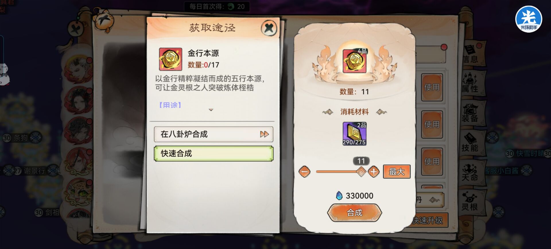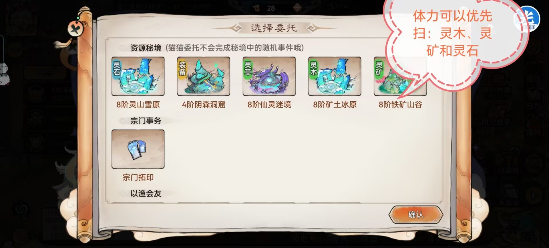 因此体力每天也是可以买1-2次的!用来刷:灵木、灵石、灵矿这三类资源。看看自己最缺哪个就优先刷哪个。